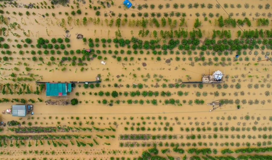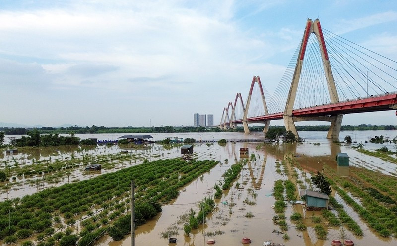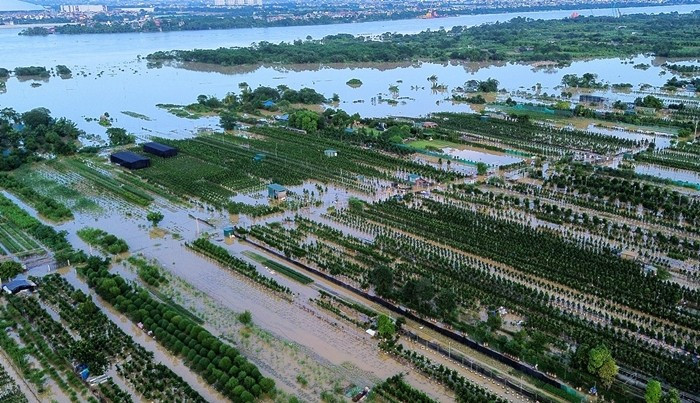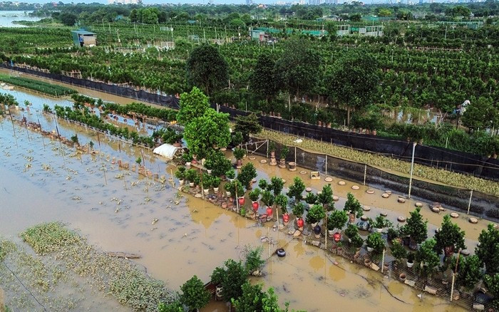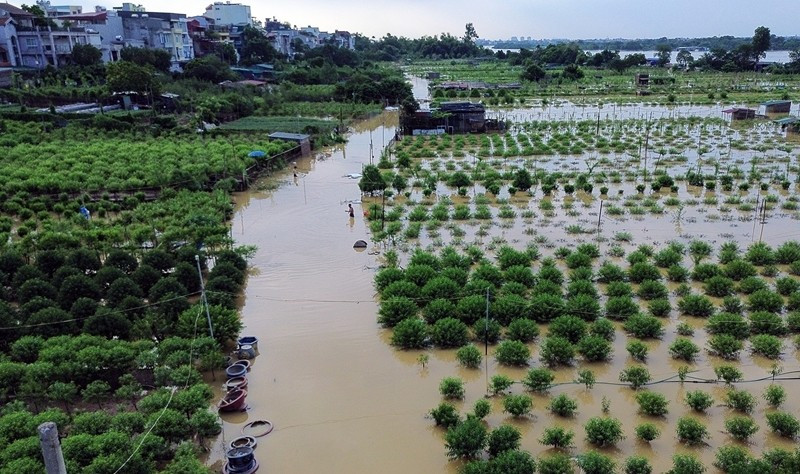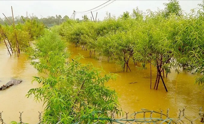 Hoàn lưu bão số 10 gây mưa lớn, nước sông Hồng dâng cao đã nhấn chìm nhiều diện tích trồng đào Tết của người dân Nhật Tân và Phú Thượng (Hà Nội). Ảnh: Znews