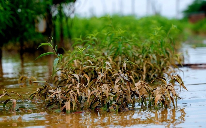 Nước dâng cao, những luống đào chỉ còn lộ phần ngọn trên mặt nước. Ảnh: Vietnamnet
