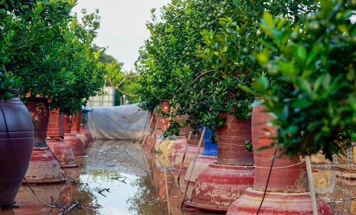 Không chỉ đào, hàng trăm gốc quất cũng chịu cảnh ngập lụt. Ảnh: Vietnamnet