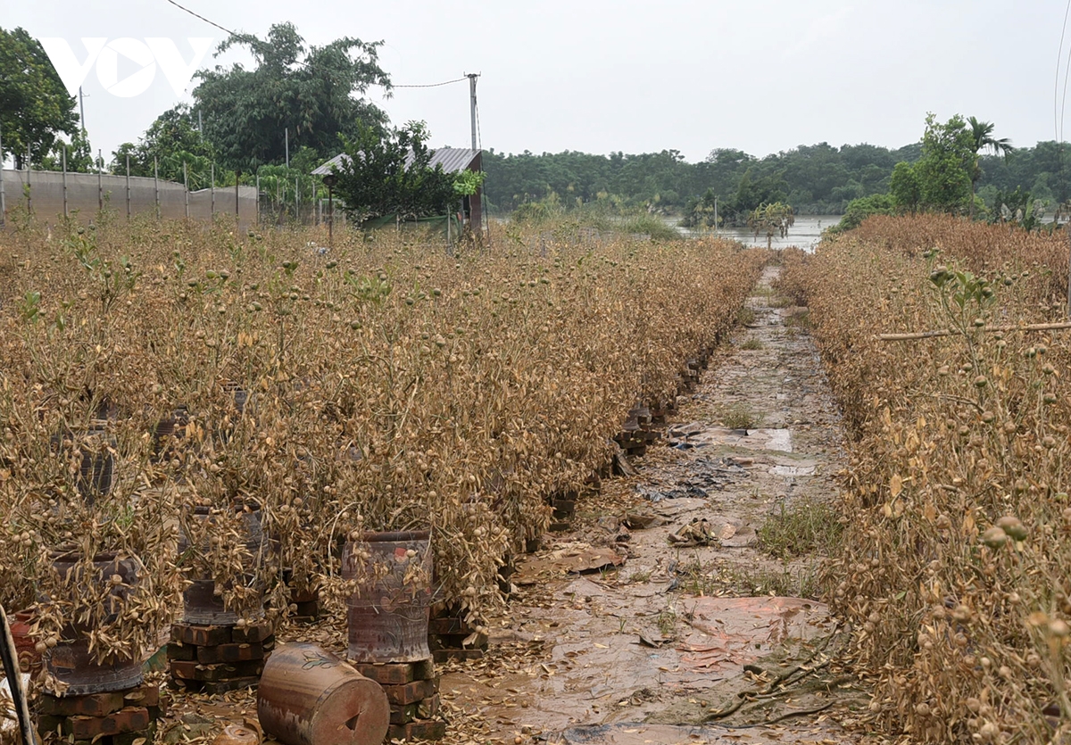 Khi nước còn chưa rút hết, theo ghi nhận của phóng viên, những gốc đào, quất ven sông Hồng đã bị khô héo khiến người nông dân không khỏi lo âu khi dự báo sẽ còn những cơn mưa lớn ở miền Bắc.