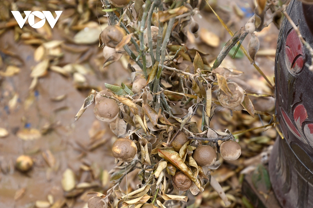 Nước rút, những gốc quất lá, quả úa bám đầy bùn.