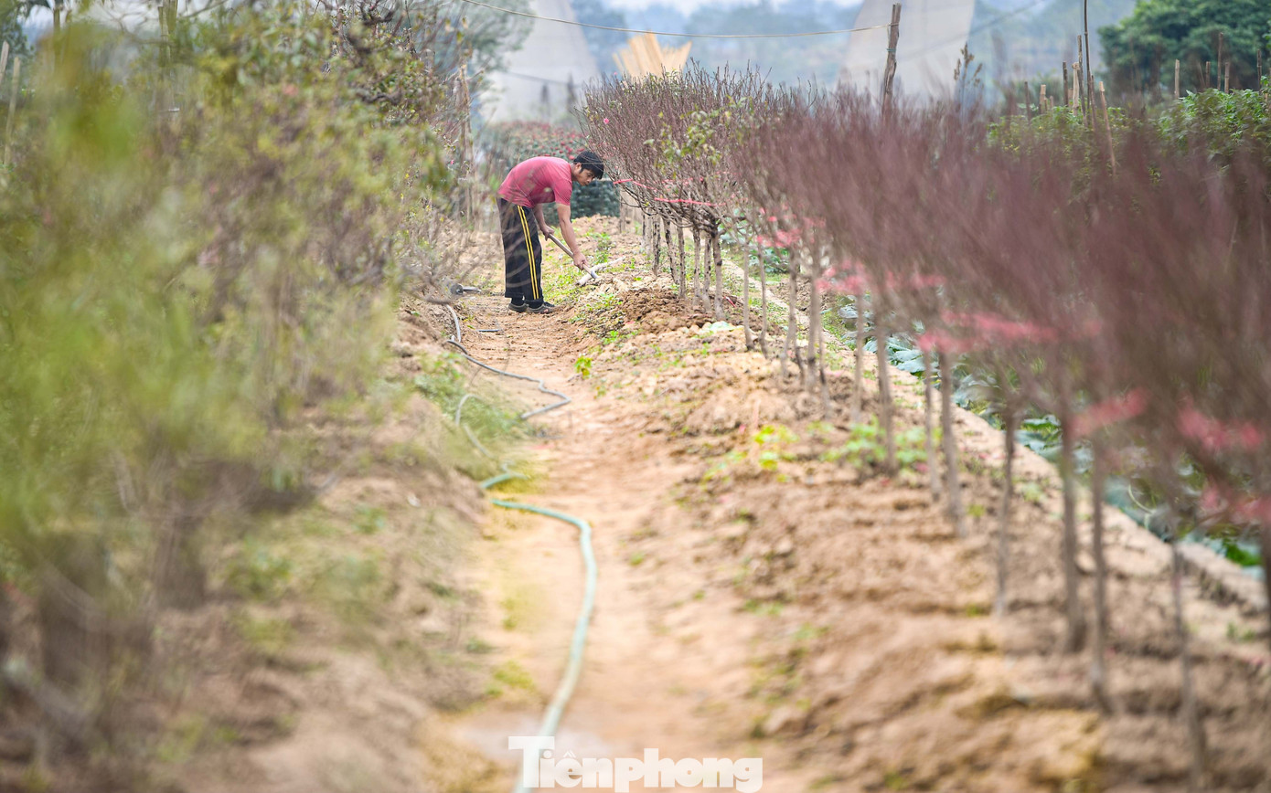 Chủ một vườn đào tại Nhật Tân chia sẻ: “Thời điểm này phải canh từng ngày. Nếu trời rét đậm kéo dài, chúng tôi phải thắp điện sưởi, còn nắng ấm thì giảm nước để kìm hoa”.