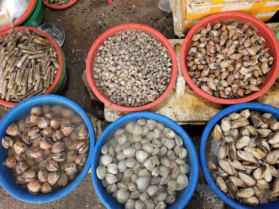 Ốc ác tươi rói, đủ cỡ đủ loại, xếp ken đặc mặt sạp – thứ quà mặn mòi của bãi triều khiến phiên chợ biển thêm phần phong phú và rộn ràng.