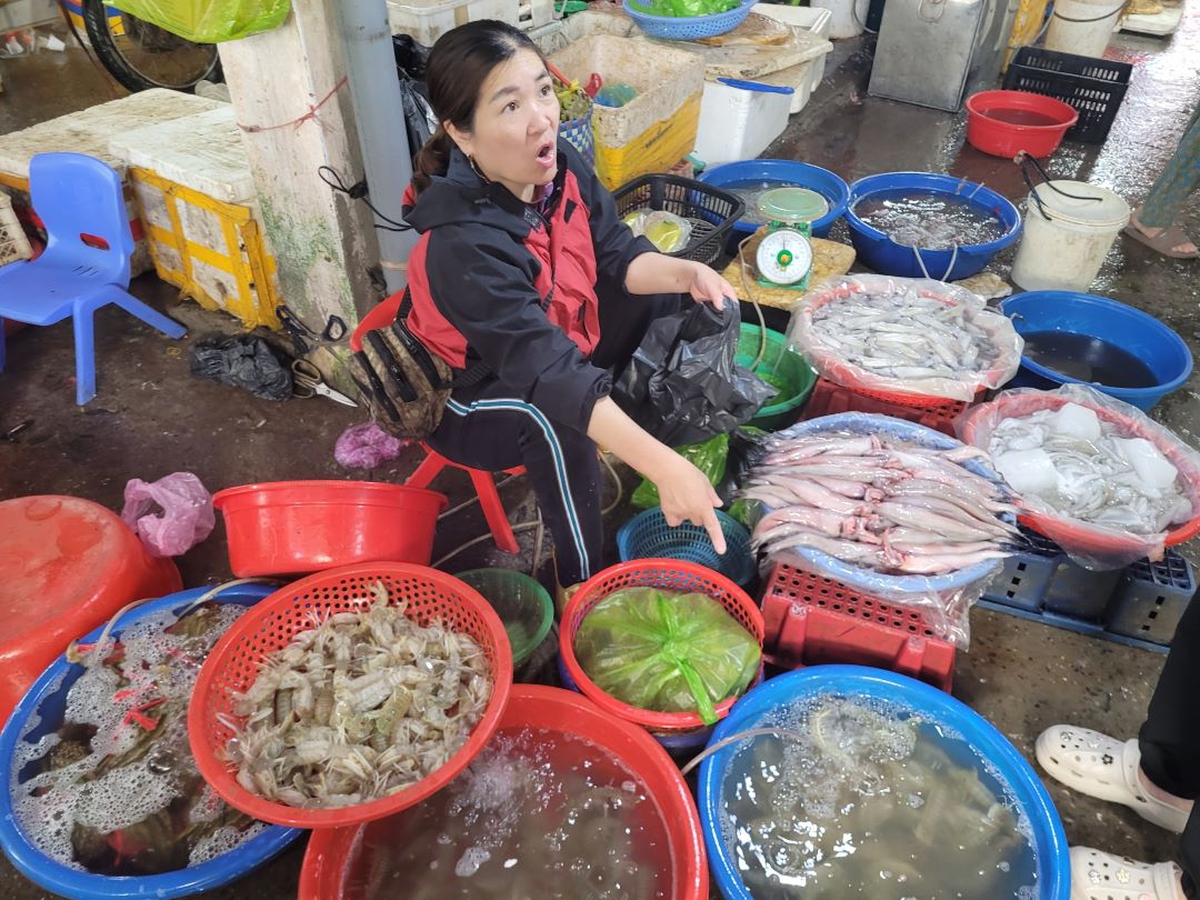 Lợi thế của chợ Gú nằm ở vị trí chỉ cách cảng cá Tân Sơn chưa đầy một cây số. Hải sản từ thuyền lên bờ gần như được chuyển thẳng tới sạp, độ tươi còn nguyên hơi nước mặn.