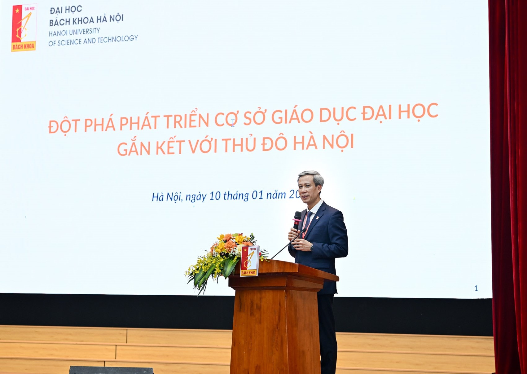 Giáo sư, Tiến sĩ Lê Anh Tuấn, Bí thư Đảng ủy Đại học Bách khoa Hà Nội trình bày tham luận tại Hội nghị gặp mặt chuyên gia, nhà khoa học, các trường Đại học, Cao đẳng, doanh nghiệp trên địa bàn Thành phố tháng 1-2026