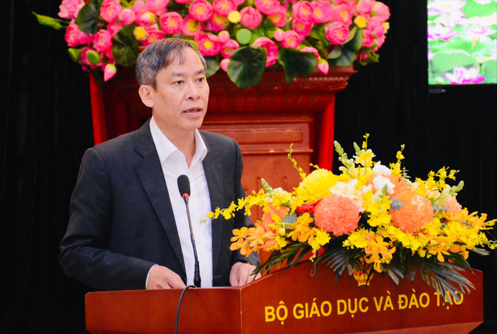 Cục trưởng Cục nhà giáo và Cán bộ quản lý giáo dục Vũ Minh Đức báo cáo tại hội nghị.