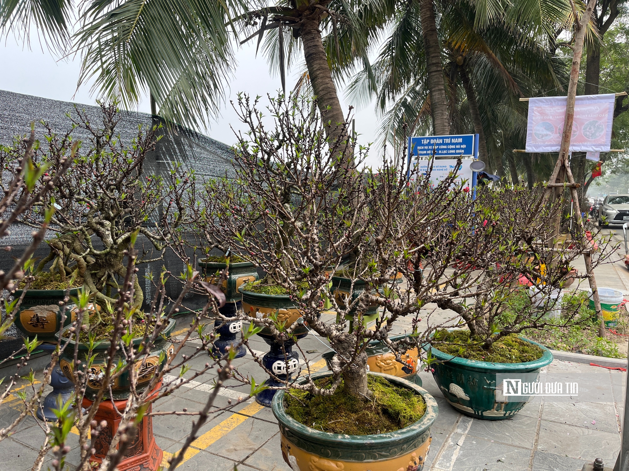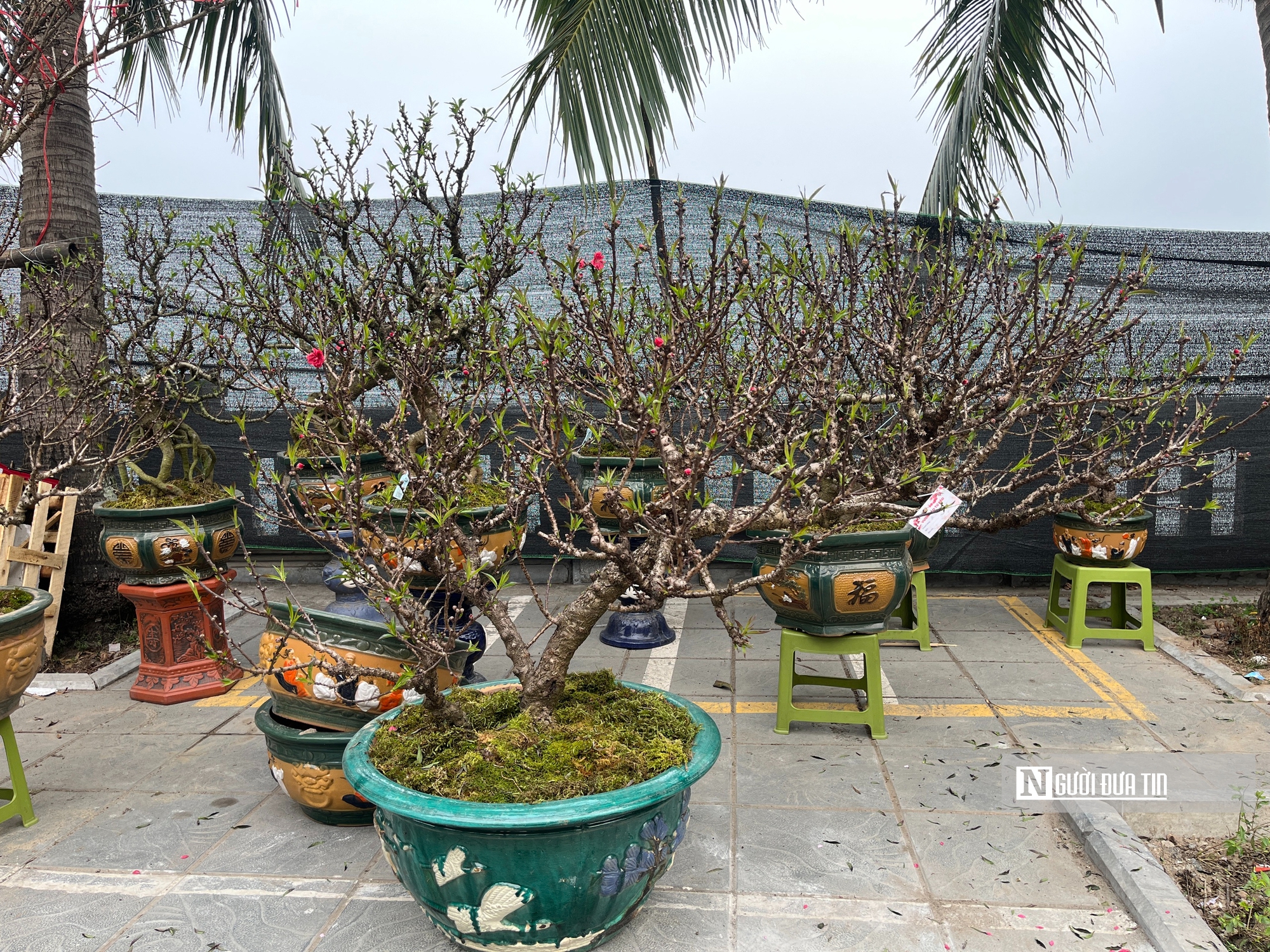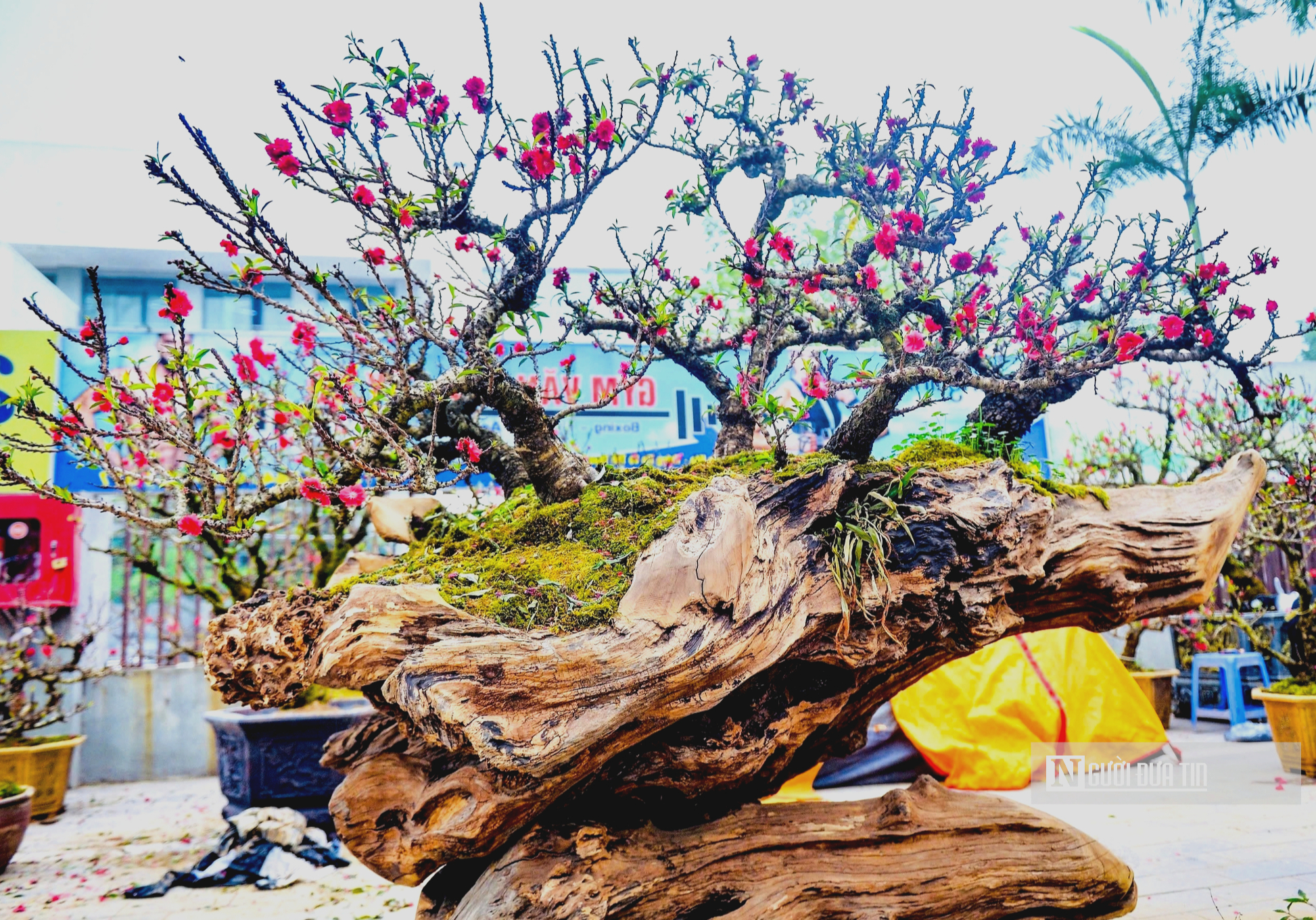 Đáng chú ý, chậu đào thất thốn trồng trên gỗ lũa được xem là những tác phẩm có giá trị cao nhất trong vườn của anh Khạc. Theo giới thiệu của chủ vườn, mỗi chậu được chào bán với giá khoảng 400 triệu đồng, trong khi giá thuê lên tới 200 triệu đồng/chậu trong dịp Tết.
