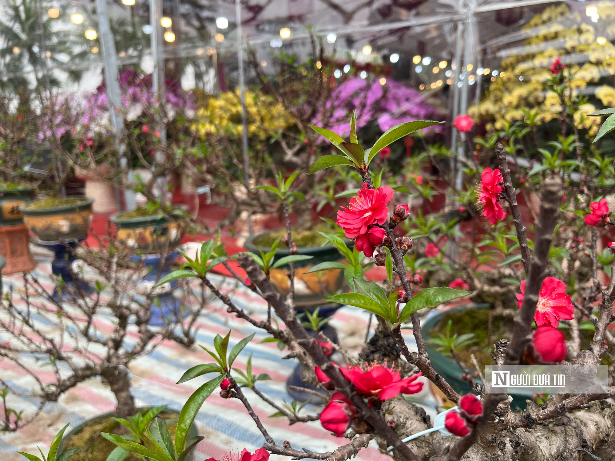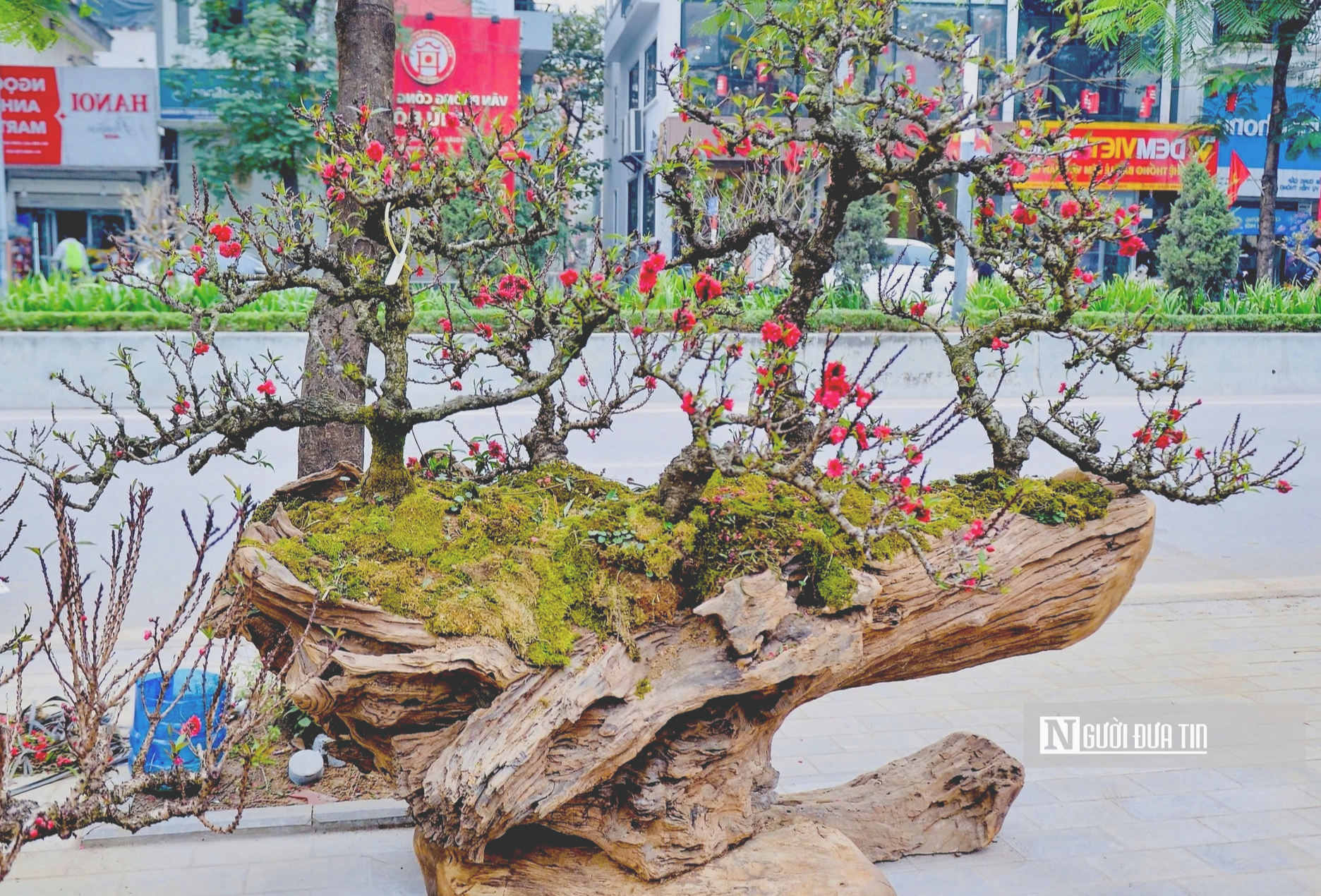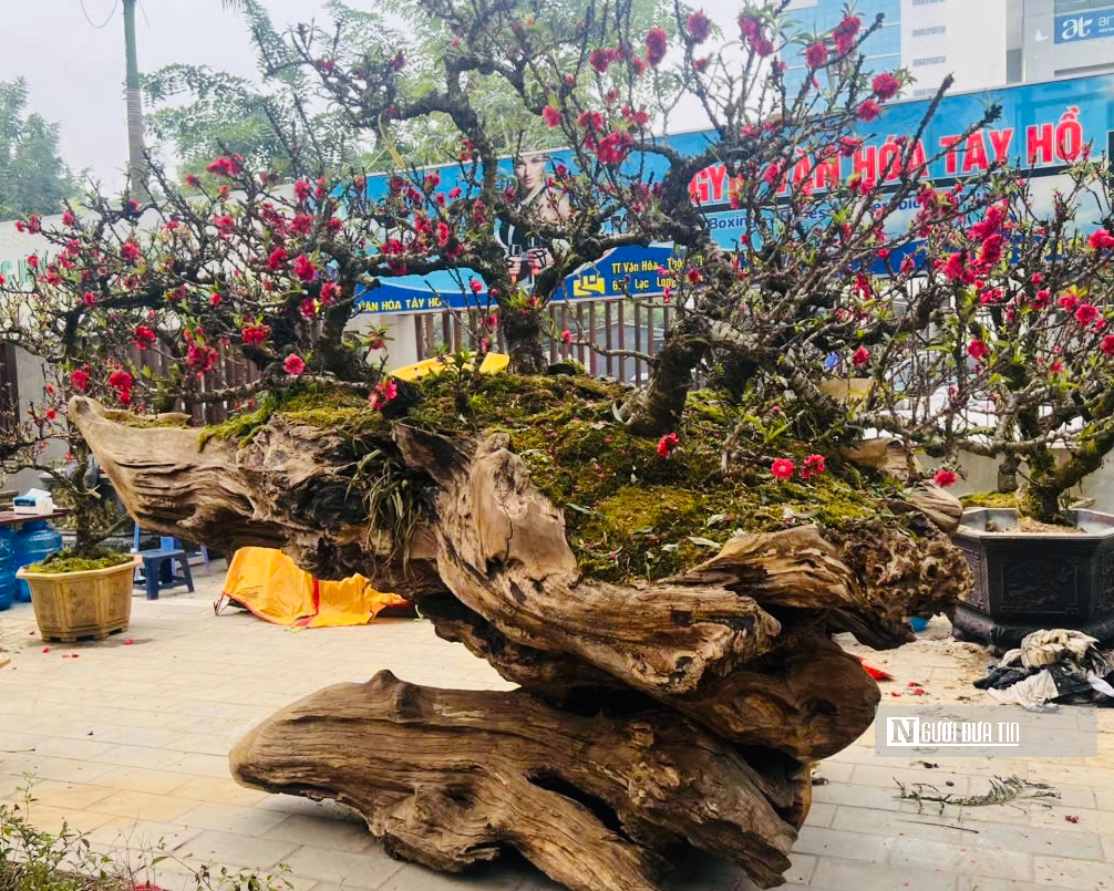 Đáng chú ý, chậu đào thất thốn trồng trên gỗ lũa được xem là những tác phẩm có giá trị cao nhất trong vườn của anh Khạc. Theo giới thiệu của chủ vườn, mỗi chậu được chào bán với giá khoảng 400 triệu đồng, trong khi giá thuê lên tới 200 triệu đồng/chậu trong dịp Tết.