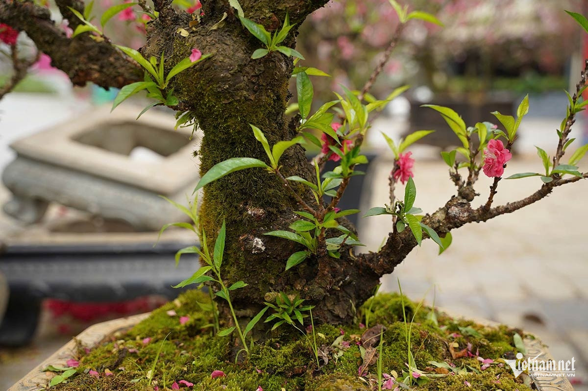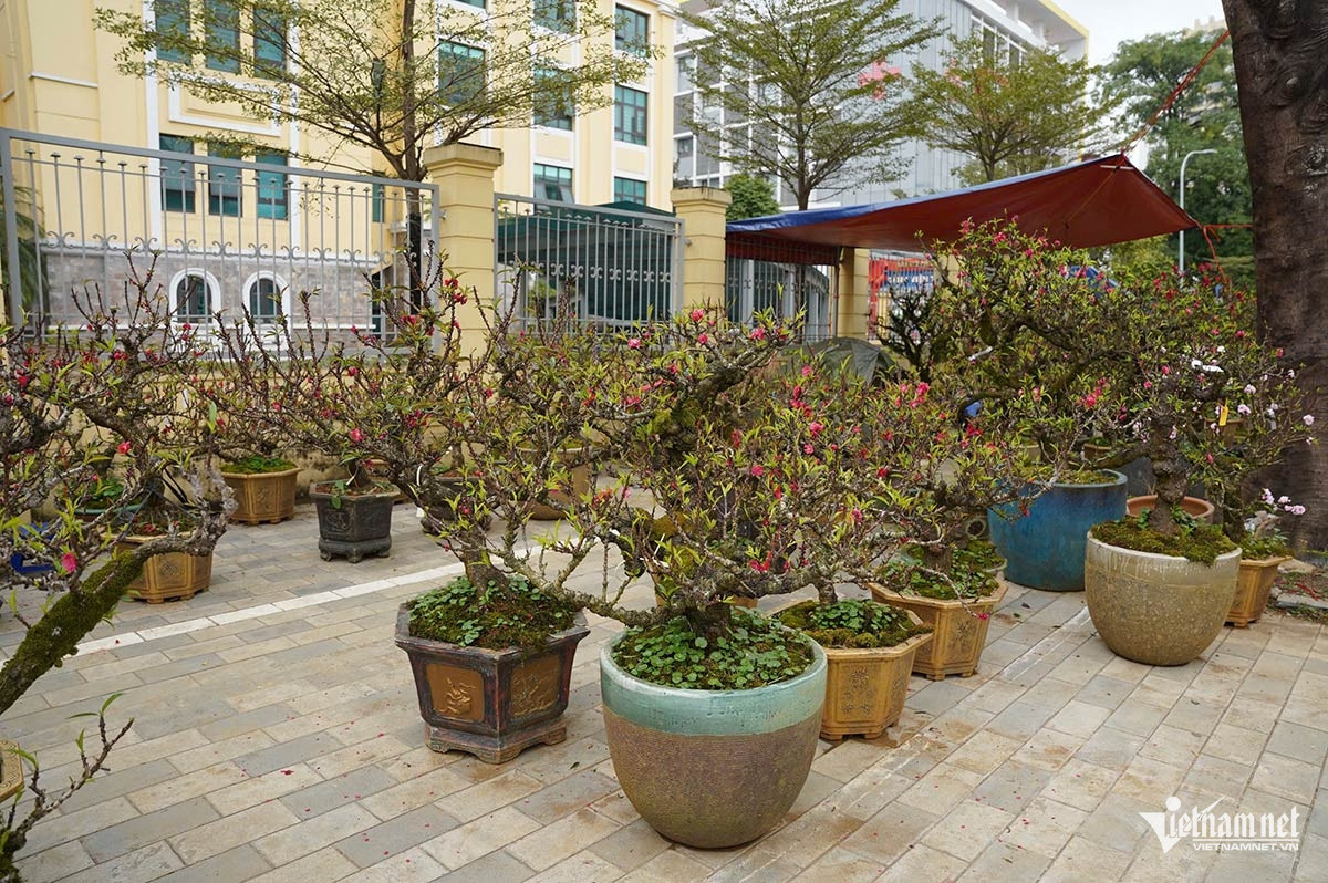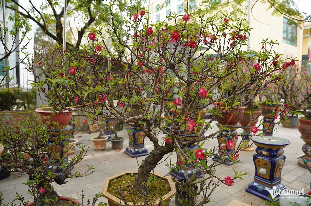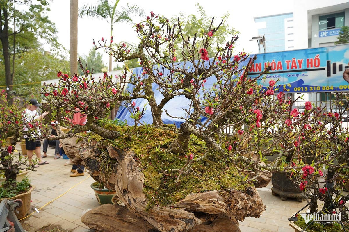 Tại khu trưng bày, nhiều gốc đào được tạo dáng cầu kỳ như thế thuyền rồng, thuyền phượng, ngũ phúc lâm môn,... được ghép từ nhiều gốc trên cùng một thân chính. Thân cây xù xì, phủ rêu phong, tán tỏa đều, hoa dày cánh, sắc đỏ thẫm tạo nên vẻ cổ kính và sang trọng.
