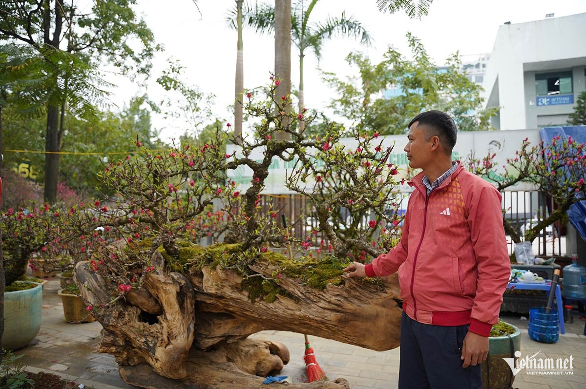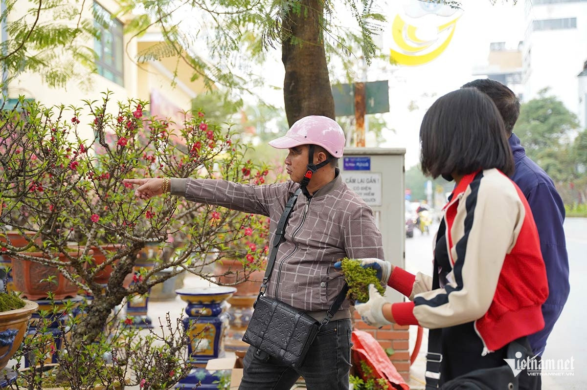 Khách hàng trực tiếp quan sát, lựa chọn từng gốc đào Thất Thốn tại khu trưng bày trên đường Lạc Long Quân. Ảnh: Thúy Anh