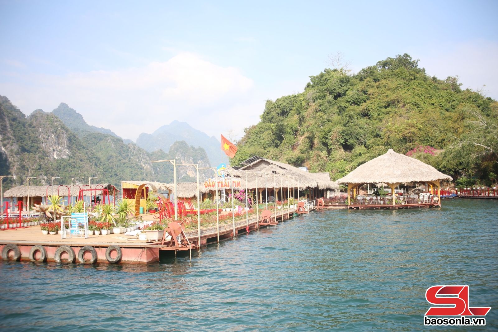 Từ bến Pá Uôn dưới chân cây cầu như dải lụa vắt ngang qua dòng sông, chúng tôi bắt đầu hành trình khám phá đảo Trái Tim và lòng hồ sông Đà. Con thuyền rời bến, chầm chậm đưa du khách tiến vào không gian lòng hồ rộng mở. Sau hơn 30 phút di chuyển, đảo Trái Tim hiện ra với các hạng mục nhà nổi, vọng ngắm cảnh, hệ thống cầu đi bộ dựng vòng quanh đảo.