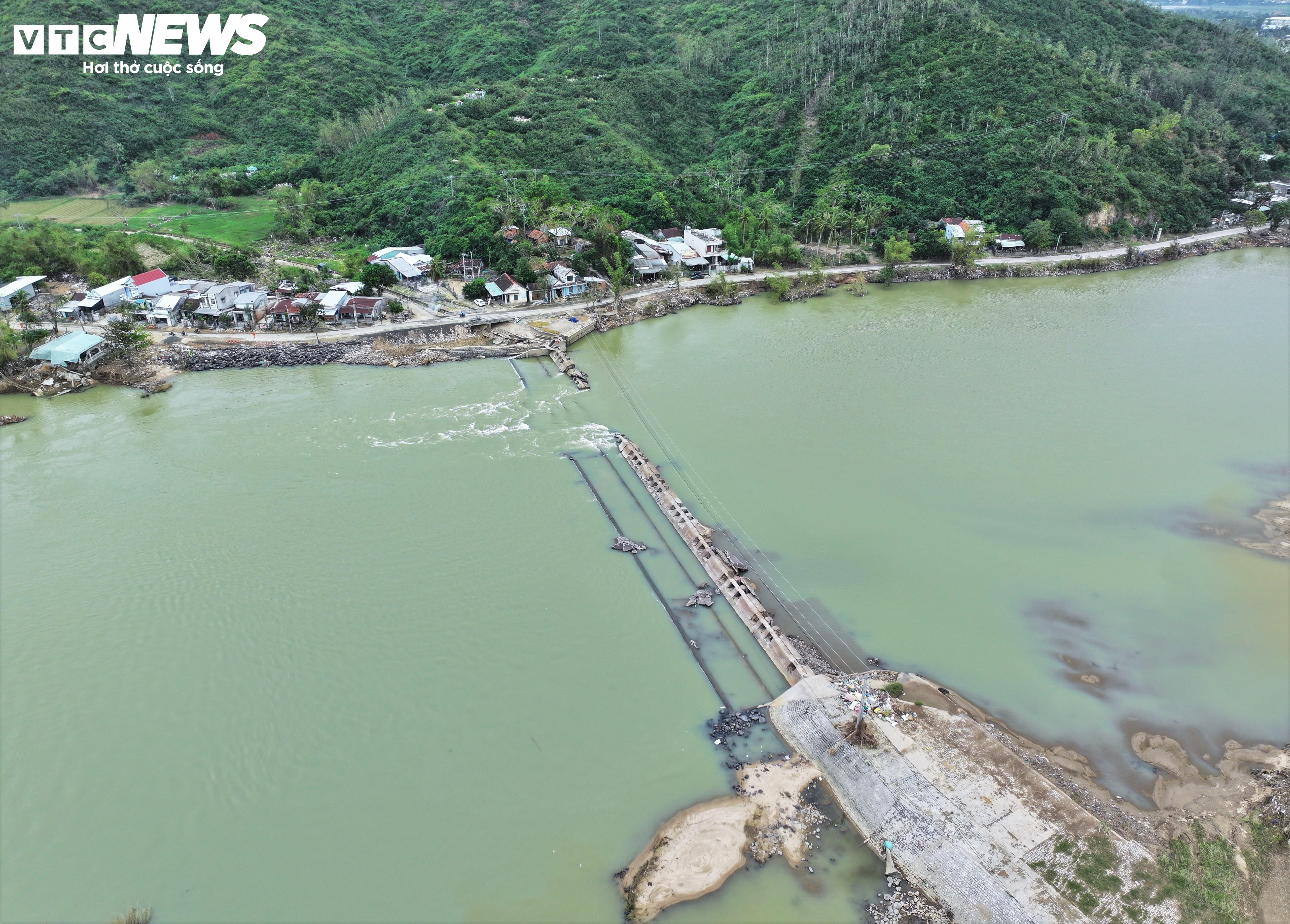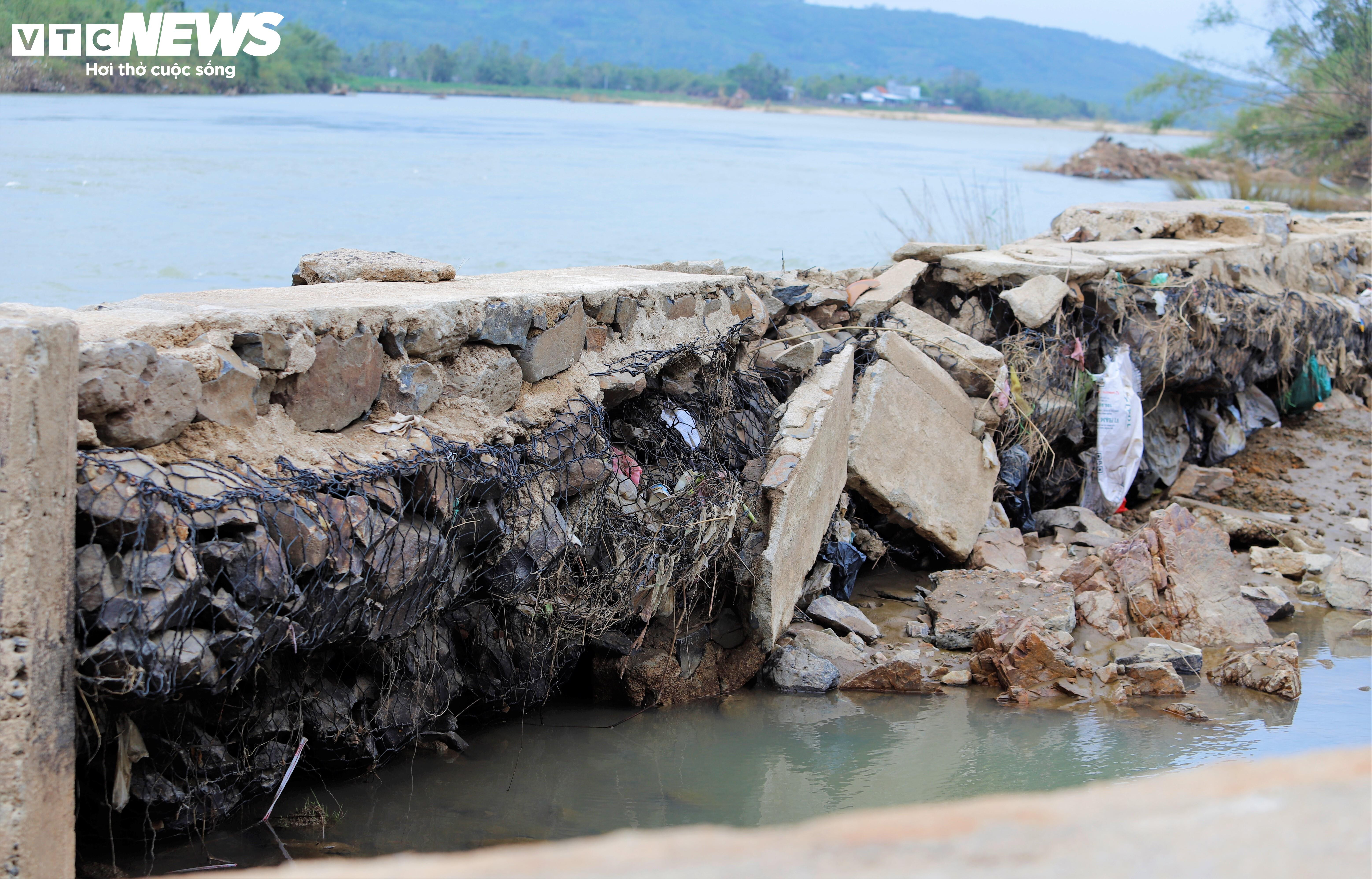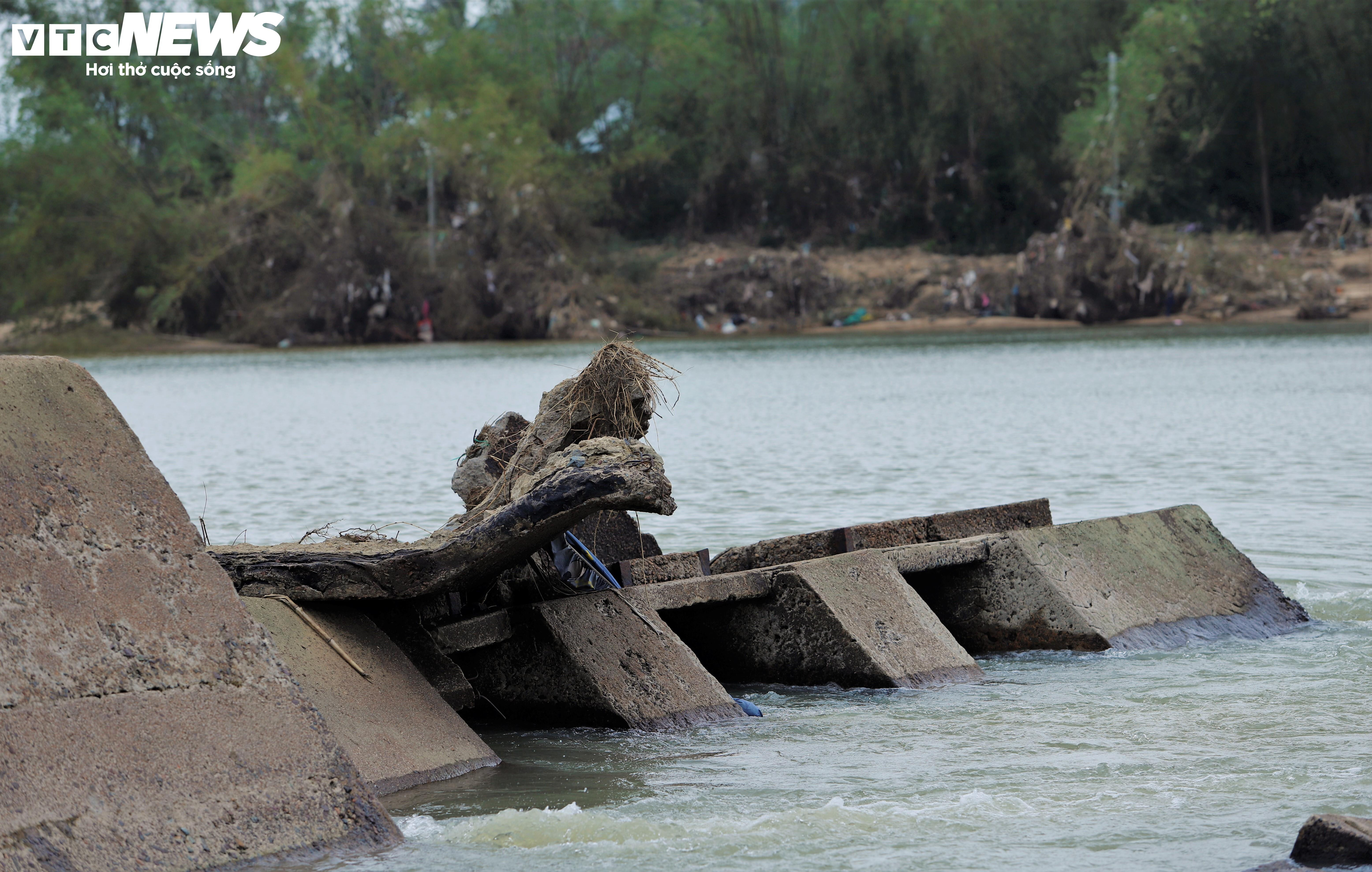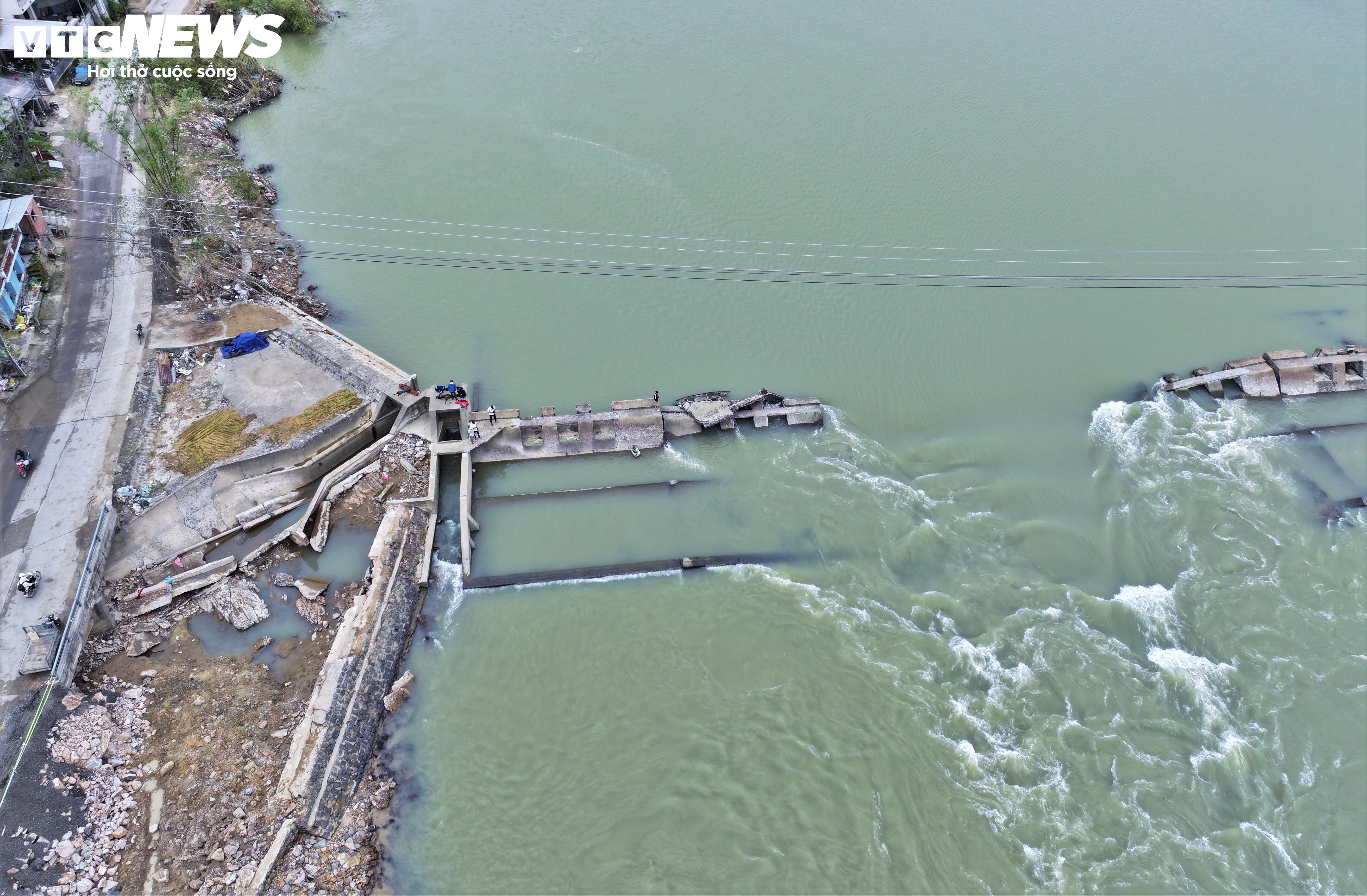 Toàn bộ vai đập Tam Giang ở 2 bên bờ bị lũ cuốn, bào mòn mất chân và hở hàm ếch lộ rõ hoàn toàn kết cấu bên trong.