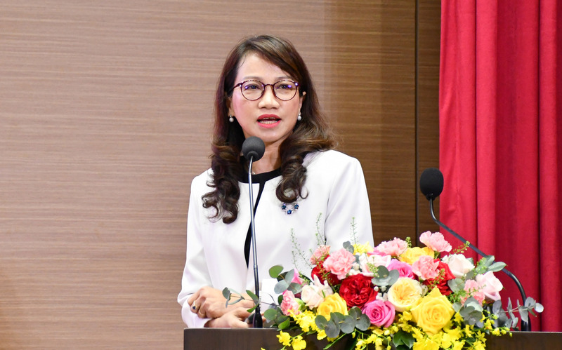GS.TS Nguyễn Thị Thanh Mai - Giám đốc Đại học Quốc gia TP. Hồ Chí Minh trình bày tham luận: "Thúc đẩy hệ sinh thái đổi mới sáng tạo thông qua chiến lược liên kết vùng Đông Nam Bộ và Đồng bằng sông Cửu Long". Ảnh: Minh Khuê.