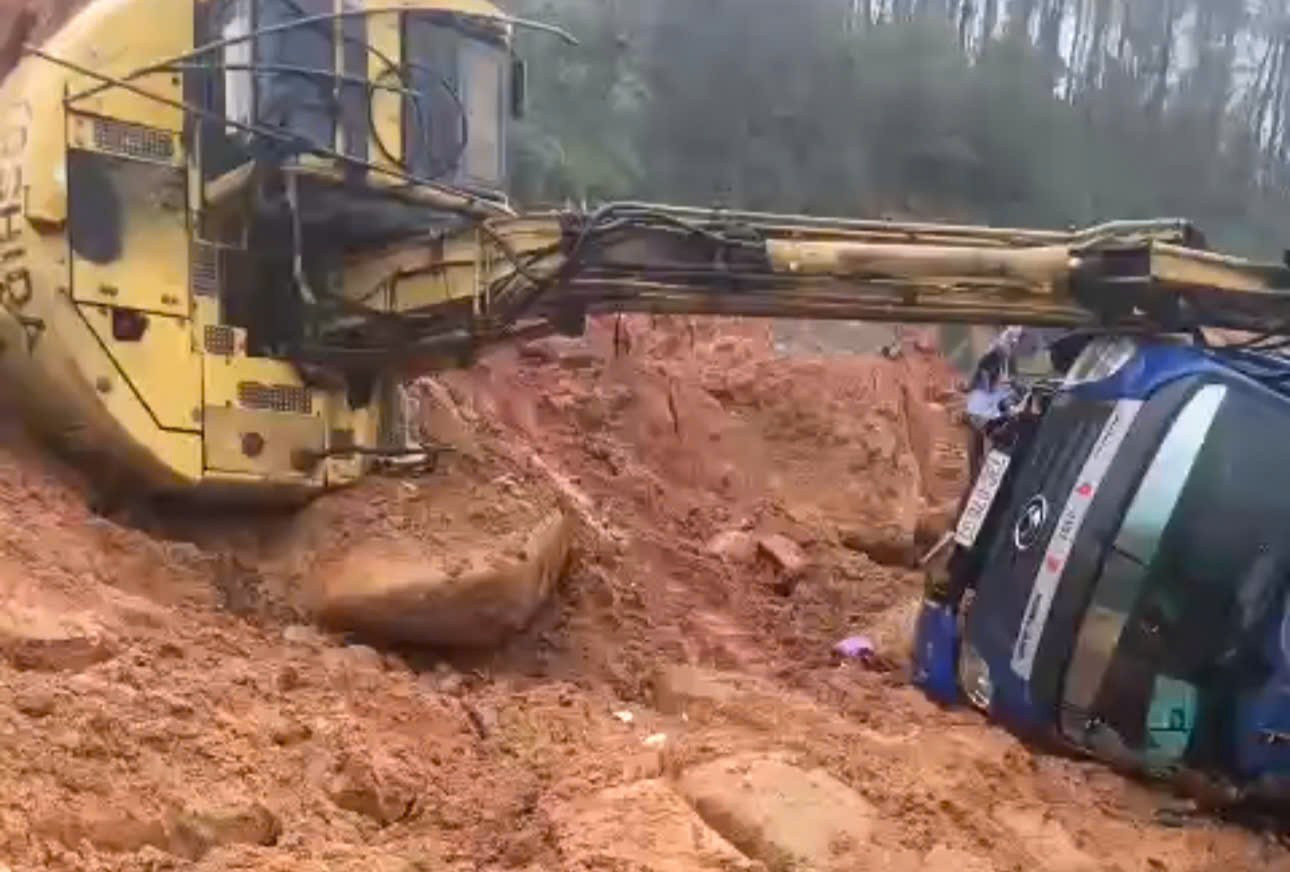 Ngay sau khi sự việc xảy ra, lực lượng chức năng đã có mặt hỗ trợ đưa các nạn nhân đi cấp cứu. Tại hiện trường, xe tải bị lật nghiêng, máy múc bị đá đè ngang thân máy.