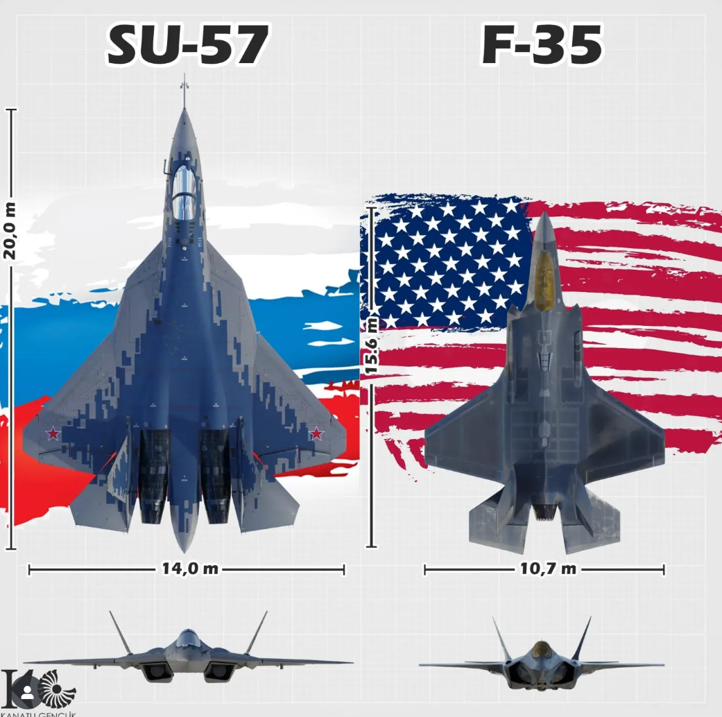 So sánh kích thước giữa tiêm kích Su-57 và F-35 - Ảnh: kanatligenclik