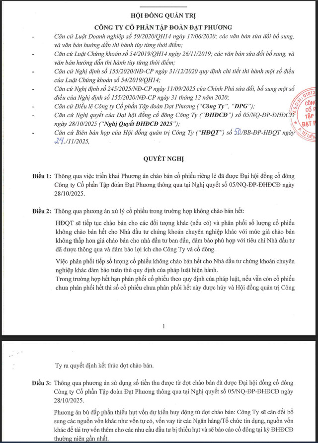 Cụ thể, HĐQT Đạt Phương đã ban hành Nghị quyết số 51/NQ-ĐP-HĐQT thông qua việc triển khai phương án chào bán cổ phiếu riêng lẻ đãđược ĐHĐCĐ thông qua tại Nghị quyết số 05/NQ-ĐP-ĐHĐCĐ ngày 28/10/2025.