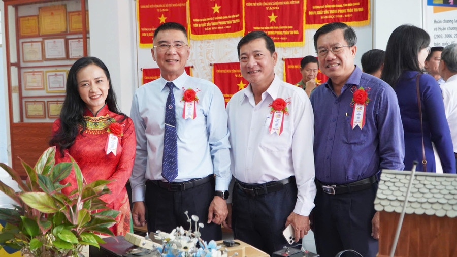 Ban Giám hiệu nhà trường qua các thời kỳ cùng các đại biểu tham quan khu trưng bày.