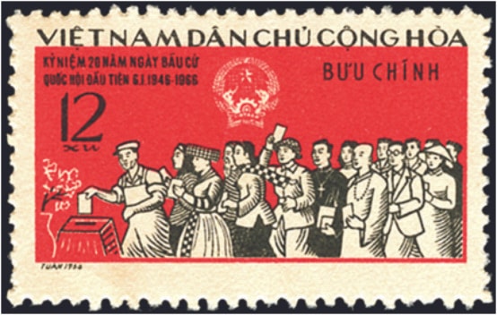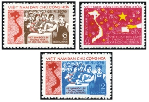 Một năm sau, ngày 25/4/1976, nhân dân hai miền Bắc - Nam nô nức tham gia Tổng tuyển cử bầu Quốc hội thống nhất. Chào mừng sự kiện này, ngày 10/4/1976, bộ tem “Tổng tuyển cử bầu Quốc hội thống nhất” đã được phát hành. Bộ tem gồm 3 mẫu, do họa sĩ Trần Lương và Trần Huy Khánh thiết kế.
