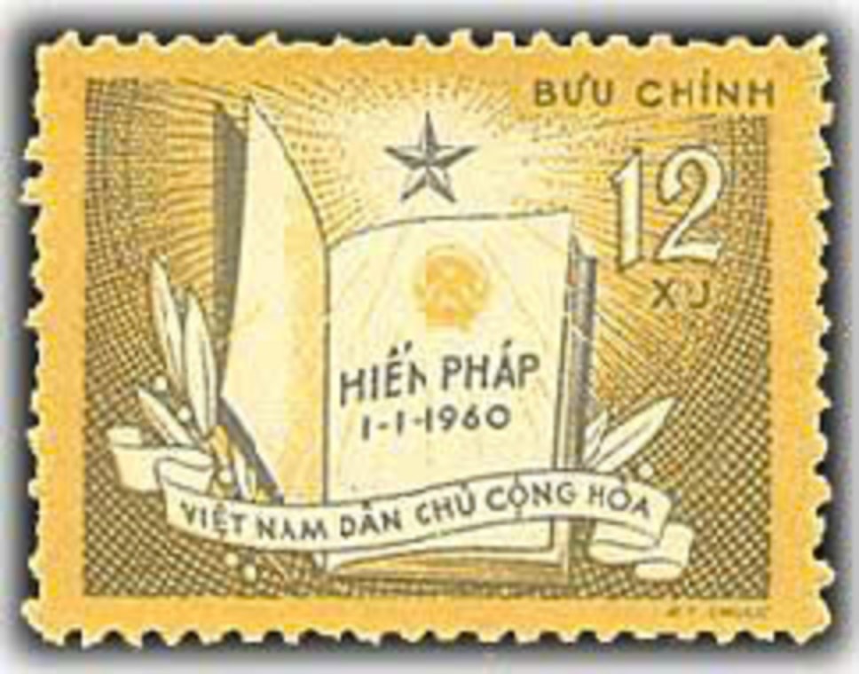 Từ đây, ngày 7/7/1960, bộ tem “Hiến pháp nước Việt Nam Dân chủ Cộng hòa” đã được phát hành. Bộ tem gồm 1 mẫu tem, do họa sĩ Bùi Trang Chước thiết kế, giá mặt 12 xu, được in 3 màu tại Nhà in Tiến Bộ.
