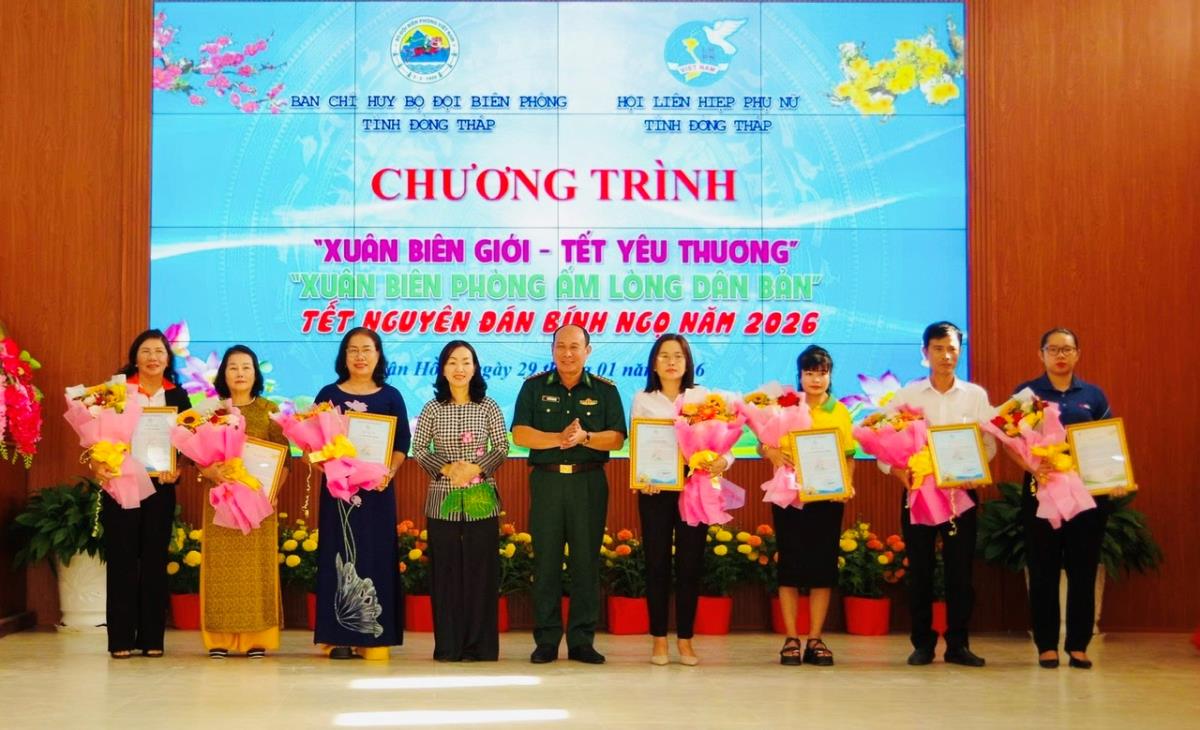 Lãnh đạo Ban Chỉ huy Bộ đội Biên phòng tỉnh Đồng Tháp và Hội Liên hiệp phụ nữ tỉnh Đồng Tháp tặng hoa, giấy khen cho các tập thể, cá nhân tích cực tham gia Chương trình "Xuân biên giới - Tết yêu thương" và "Xuân Biên phòng ấm lòng dân bản" Xuân Bính Ngọ 2026 tại Đồng Tháp Ảnh: Đơn vị cung cấp