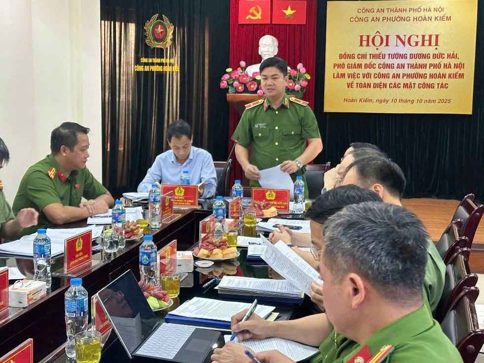 Thiếu tướng Dương Đức Hải - Phó Giám đốc CATP Hà Nội làm việc với Công an phường Hoàn Kiếm.