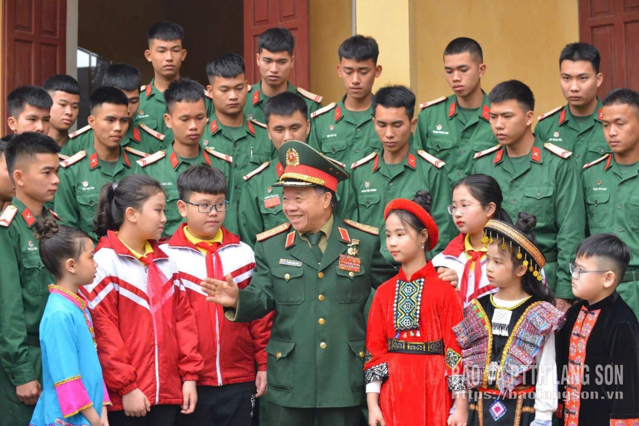 Trung tướng Dương Công Sửu nói chuyện truyền thống cùng các chiến sĩ trẻ và các cháu thiếu niên, nhi đồng Ảnh: Bích Hợp
