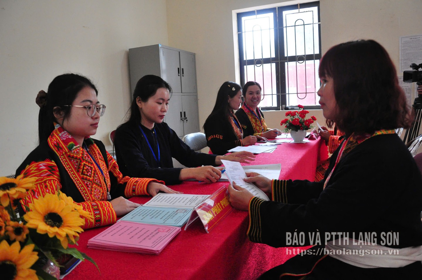 Cử tri xã Mẫu Sơn nhận phiếu tại khu vực phát phiếu