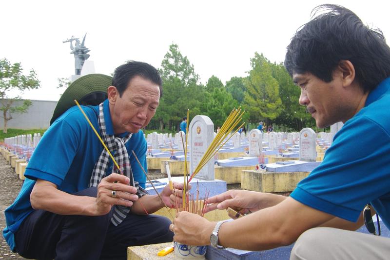 Nhạc sĩ Thế Hiển và nhà thơ Phan Hoàng thắp hương ở nghĩa trang liệt sĩ Vị Xuyên, vùng biên giới Việt- Trung.