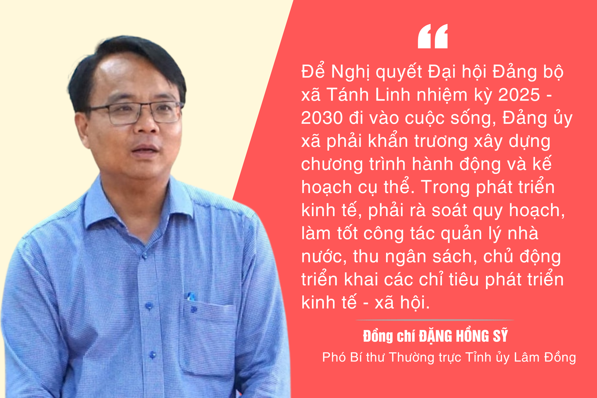 Đồng chí Trần Vũ Linh, Bí thư Đảng ủy, Chủ tịch HĐND xã Tánh Linh cho biết: Trong nhiệm kỳ tới, Đảng bộ xã Tánh Linh quyết tâm xây dựng Đảng và hệ thống chính trị trong sạch, vững mạnh, nâng cao hiệu lực, hiệu quả hoạt động quản lý của Nhà nước; tập trung phát triển nông nghiệp bền vững, dịch vụ và công nghiệp, phát triển kinh tế tư nhân mạnh mẽ, gắn với chuỗi phát triển nông nghiệp, công nghiệp và dịch vụ.