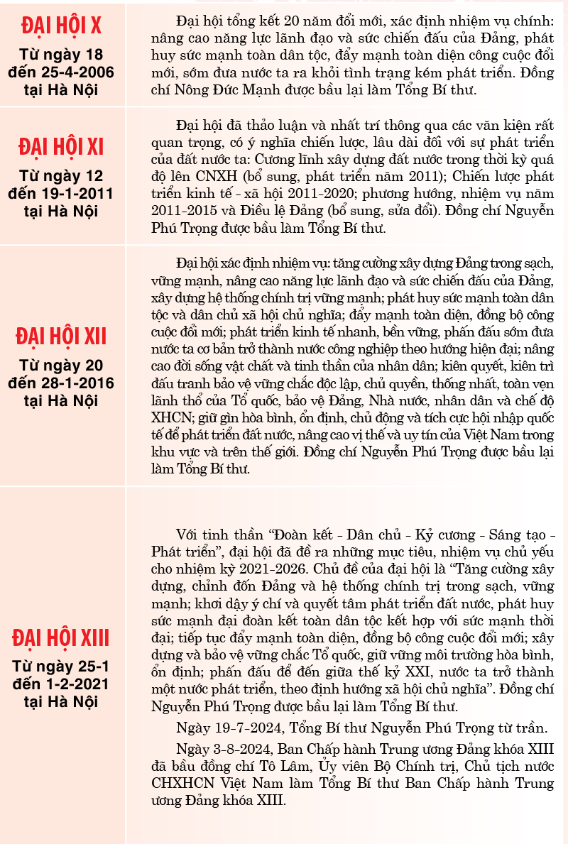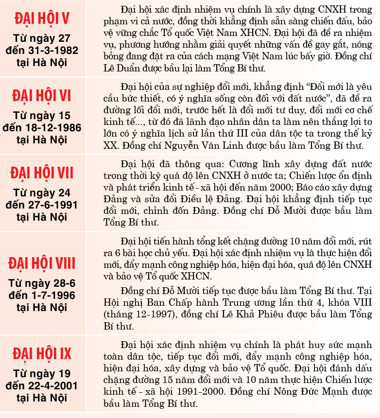 Các kỳ Đại hội Đảng Cộng sản Việt Nam, bắt đầu từ năm 1935, là những dấu mốc quan trọng định hướng chiến lược phát triển đất nước. Mỗi kỳ đại hội đều tổng kết chặng đường đã qua và đề ra phương hướng, nhiệm vụ cho nhiệm kỳ mới.
