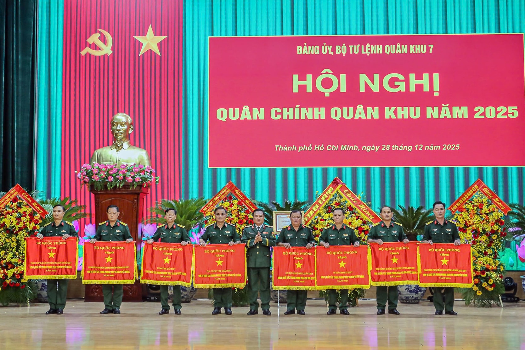 Đại diện Phòng Chính trị, Bộ CHQS tỉnh (bên phải) nhận Cờ thi đua của Bộ Quốc phòng năm 2025