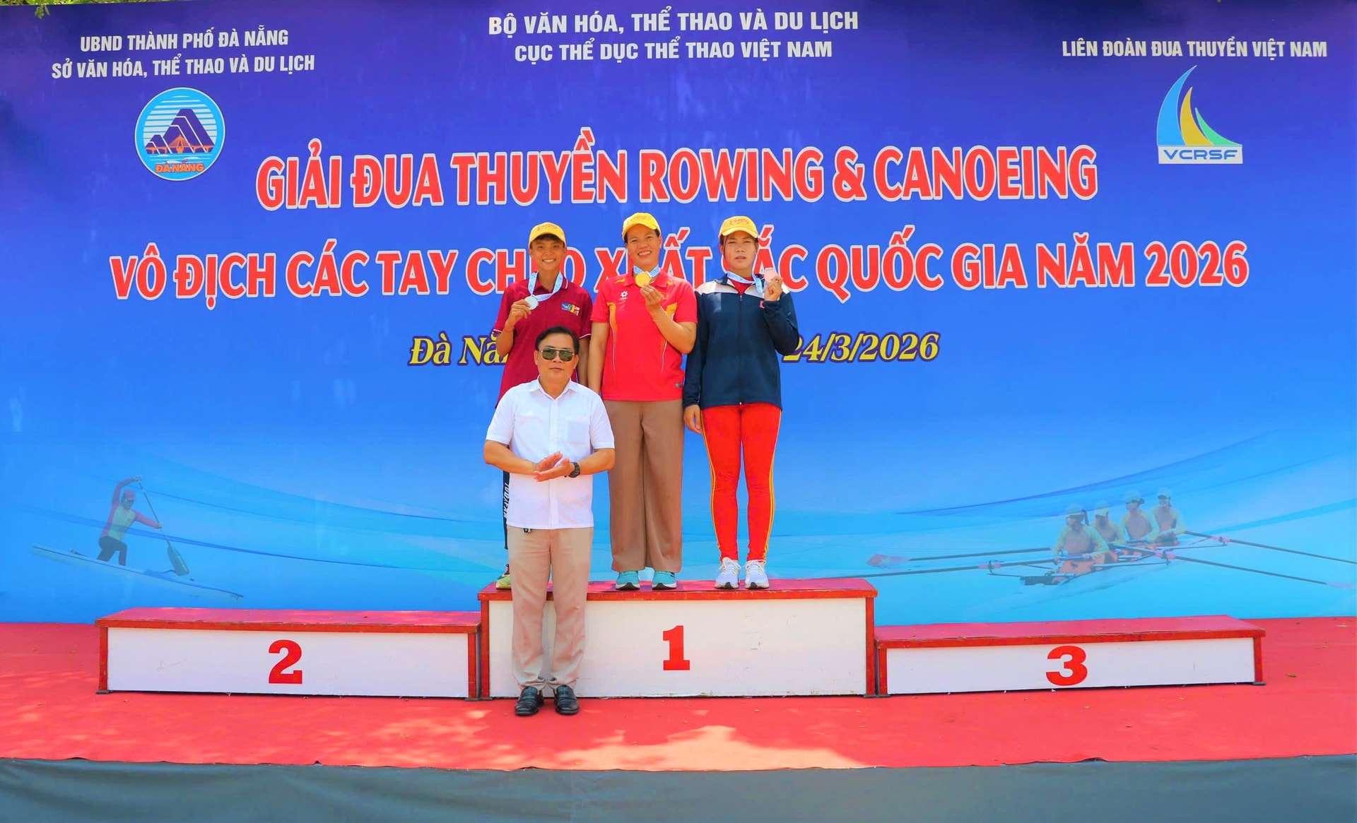 Phạm Thị Huệ (giữa) là tay chèo nổi bật của thể thao thành tích cao Đà Nẵng, vừa xuất sắc giành 2 Huy chương Vàng tại Giải đua thuyền Rowing vô địch các tay chèo xuất sắc quốc gia năm 2026, diễn ra trên hồ Đồng Nghệ (xã Hòa Tiến). Ảnh: PHI NÔNG