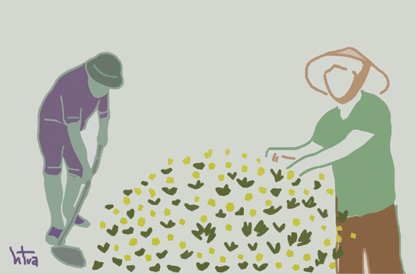 Bây giờ nhìn lớp bùn non dẻo quánh trong chiếc cào của anh Miên, tôi biết mùa lụt năm nay để lại một lớp “đất vàng” cho nhà nông, nhưng để có mùa vàng cho cây lá, cho vụ hoa Tết năm nay thì người làm nông còn phải vất vả nhiều. Anh Miên cho biết từ ngày vợ anh bị đau lưng, chị không còn đi làm đồng cùng anh nữa, một mình anh trên cánh đồng, vừa không đủ sức, vừa thấy cô đơn, nên vụ hoa Tết năm nay anh giảm bớt, chỉ trồng bằng nửa năm ngoái.