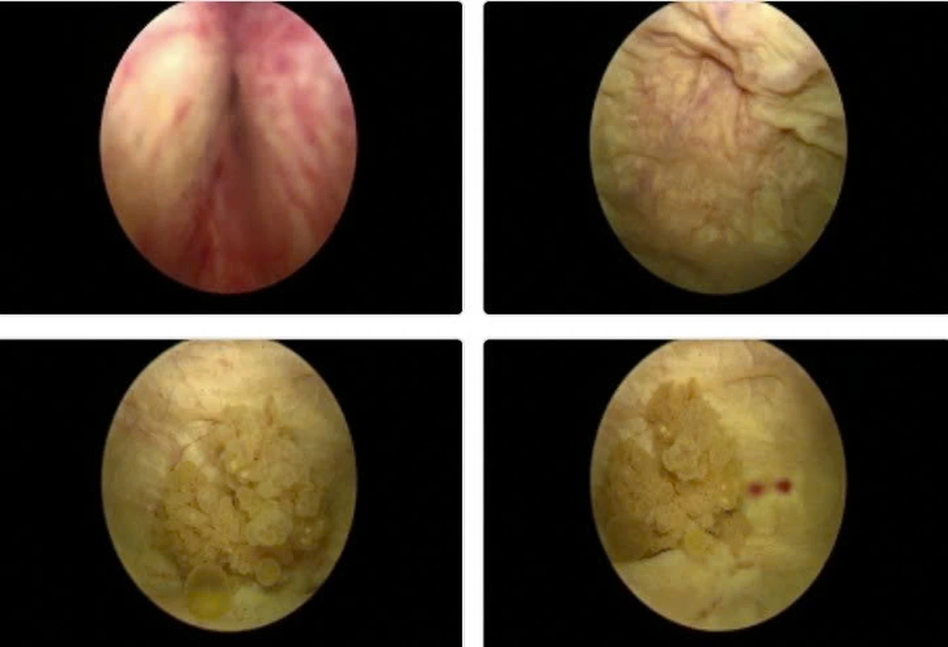 Hình ảnh nội soi u bàng quang vị trí sát lỗ niệu quản trái kích thước 2cm, có chỉ định phẫu thuật nội soi cắt u bàng quang sớm để chẩn đoán tế bào học (Ảnh: Bệnh viện cung cấp).