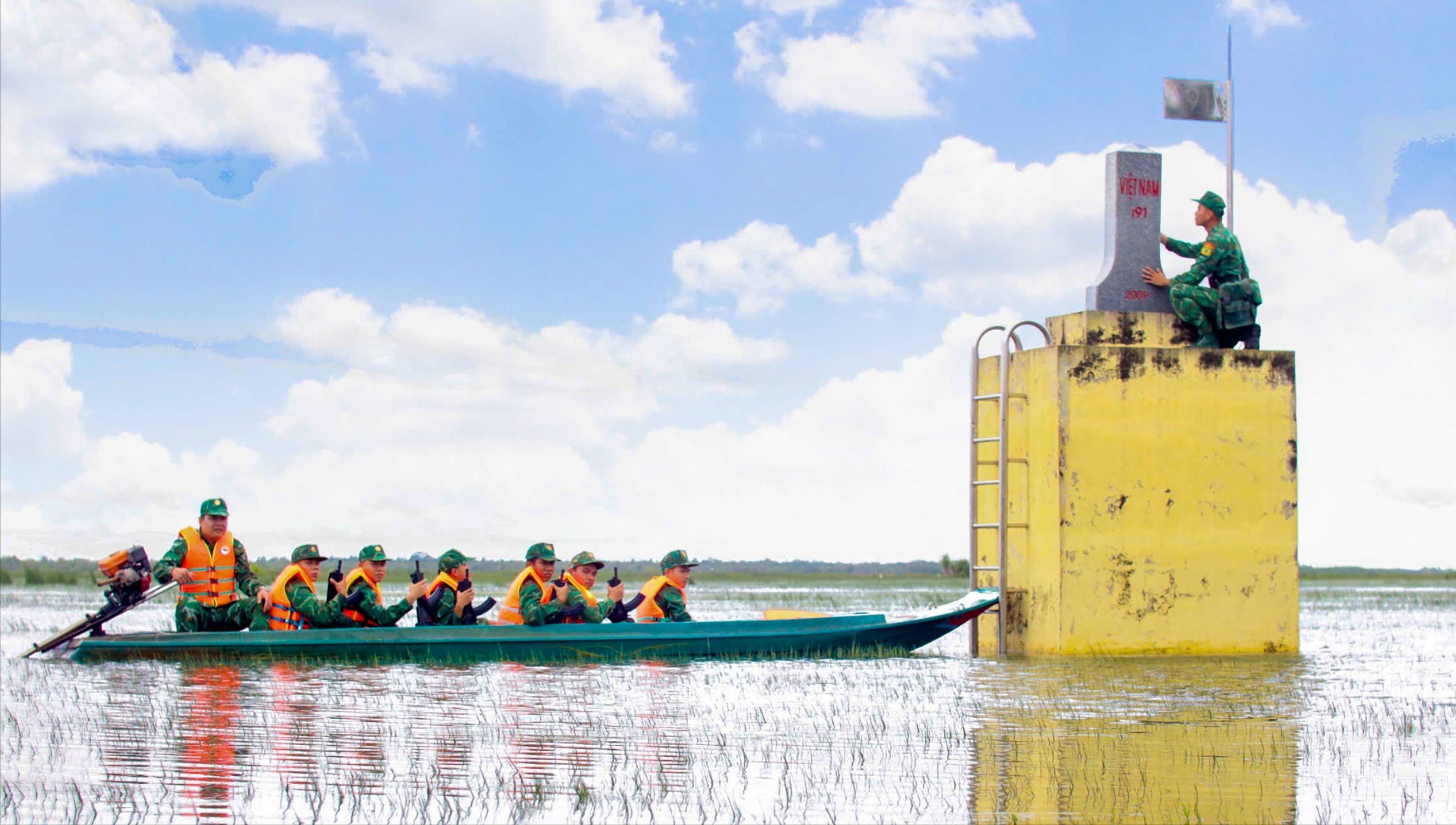 Bộ đội Biên phòng Tây Ninh tuần tra giữa mùa nước nổi tại khu vực cột mốc biên giới 191