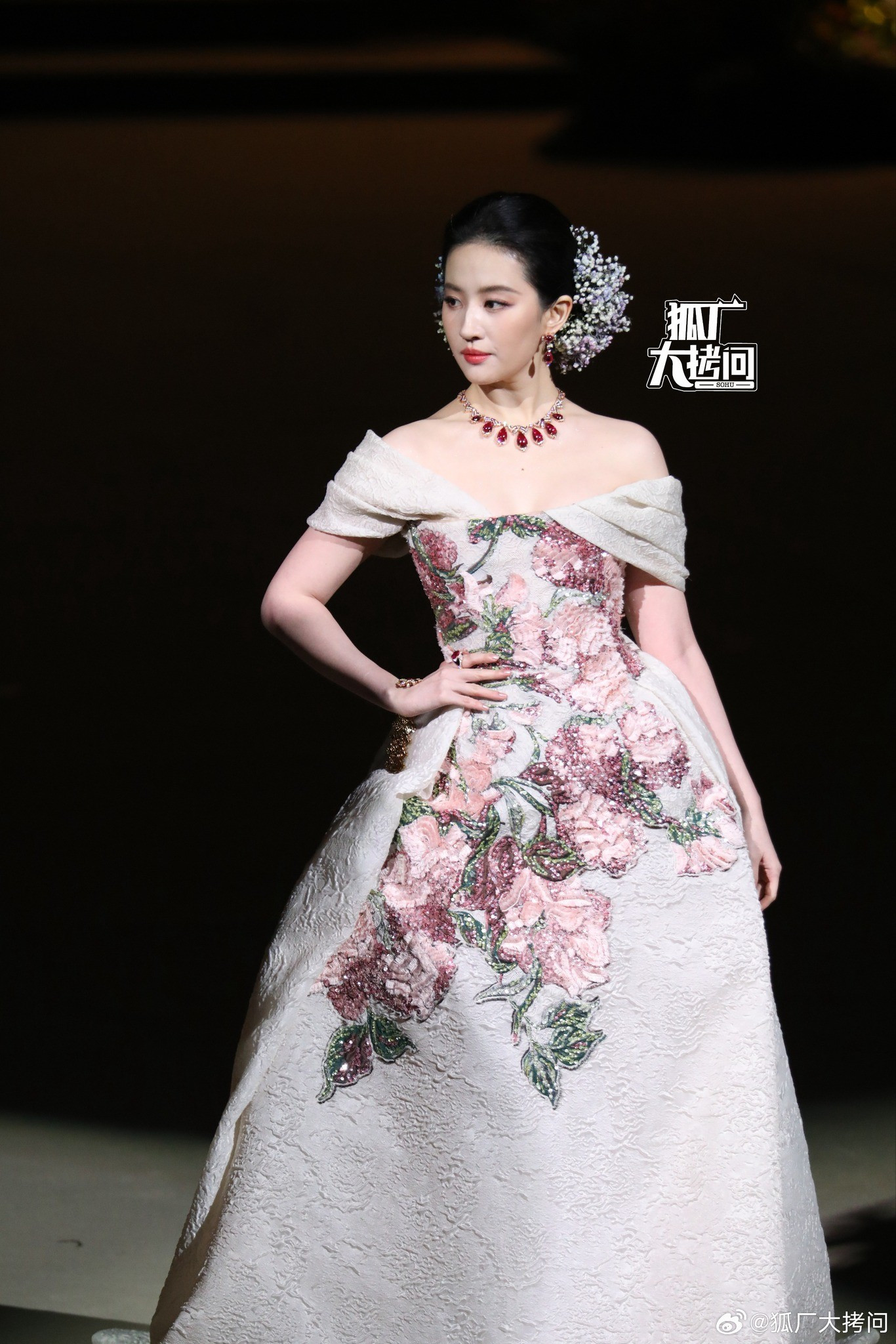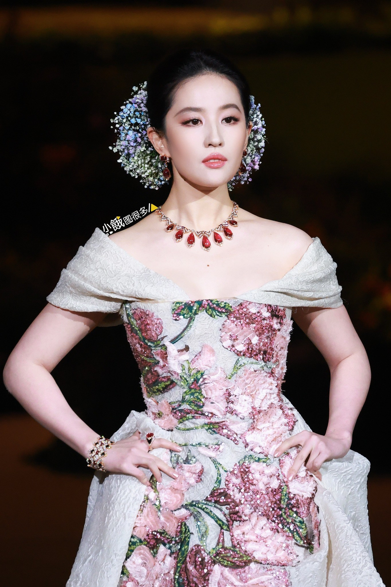 Lưu Diệc Phi mặt không hề biến sắc dù đã phát hiện ra sự cố, vừa bước đi thong dong và mỉm cười nhẹ nhàng như chẳng có chuyện gì xảy ra, trong lúc ấy cô khéo léo dùng ngón tay giữ chiếc vòng không cho rơi xuống đất.