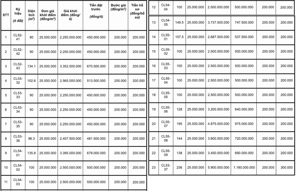 Các ô đất có diện tích từ 90 đến hơn 230 m2, tương đương giá khởi điểm từ 2,2 tỷ đồng đến 5,9 tỷ đồng.