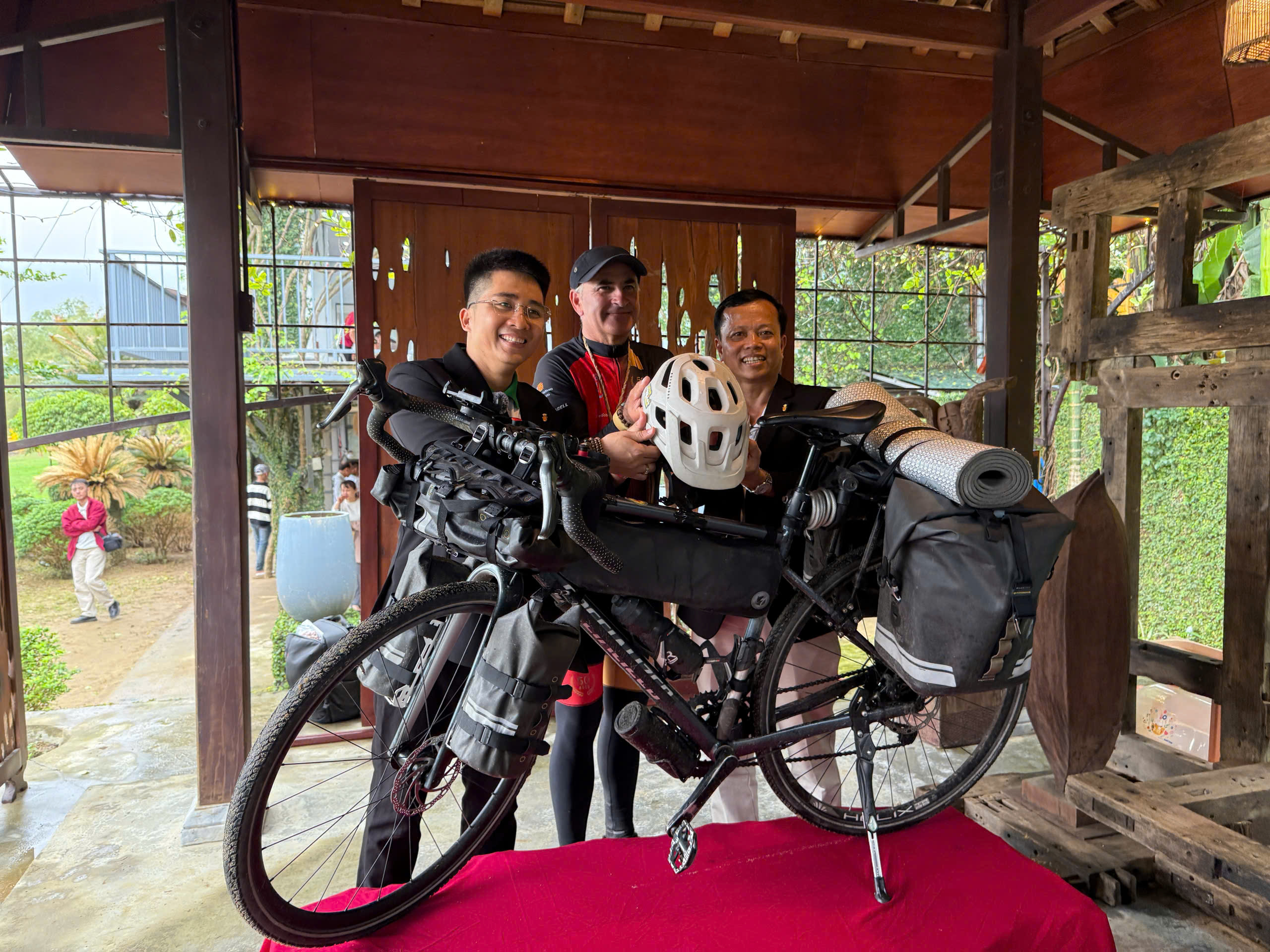 Vận động viên Marino Izquierdo Juan trao tặng chiếc xe đạp và hành trang cho đại diện Cộng đồng yêu Gò Nổi. Ảnh: NGUYỄN CƯỜNG
