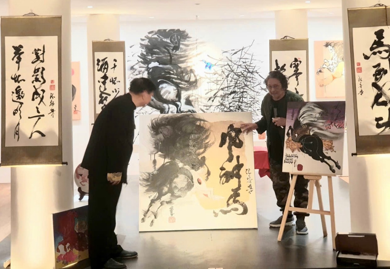 Họa sĩ Lê Trí Dũng (bên phải) giới thiệu tranh "Phong thần mã". Ảnh: Năng Lực