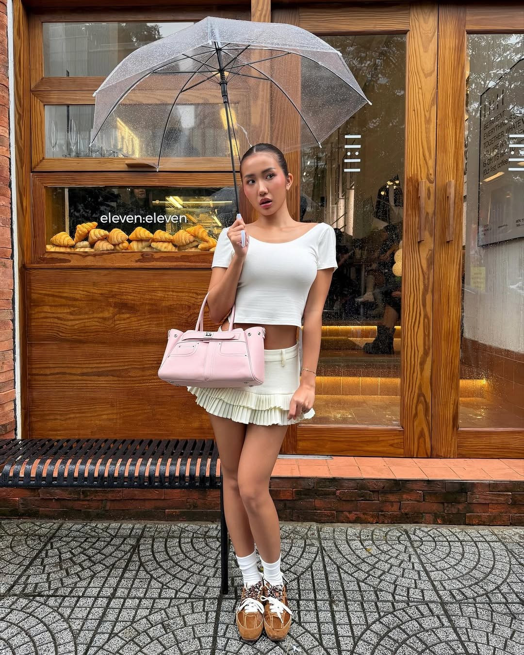 Đi cùng là chiếc chân váy mini màu kem với phần gấu được thiết kế xếp ly bèo nhún điệu đà, tạo độ bồng bềnh và giúp đôi chân thêm dài. Chi tiết này mang lại sự trẻ trung, năng động, pha trộn giữa nét thể thao và sự nữ tính, tiểu thư. (Ảnh: IGNV)
