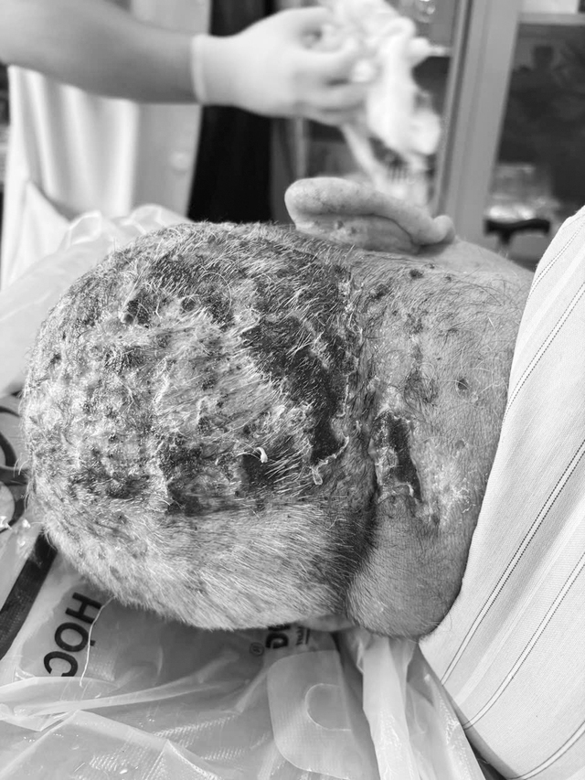 Rất may, sau 3 ngày điều trị tích cực, vết thương của cụ K. đã se lại và có tiến triển tốt. Khi ổn định, bệnh nhân sẽ được phẫu thuật cắt bỏ phần hoại tử sau gáy, vệ sinh vết thương và loại bỏ phần lá bám sâu vào da đầu.