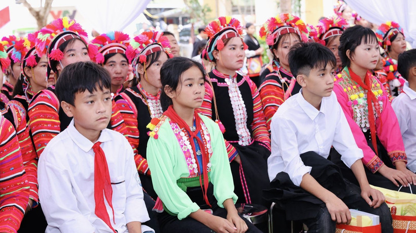 Học sinh và người dân tham dự lễ khởi công tại điểm Trường phổ thông nội trú liên cấp Hua Bum, tỉnh Lai Châu (Ảnh: Bộ Giáo dục và Đào tạo)