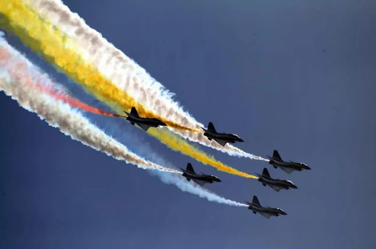Máy bay chiến đấu J-20 của Trung Quốc bay theo đội hình tại một triển lãm hàng không. (Nguồn: China Daily)