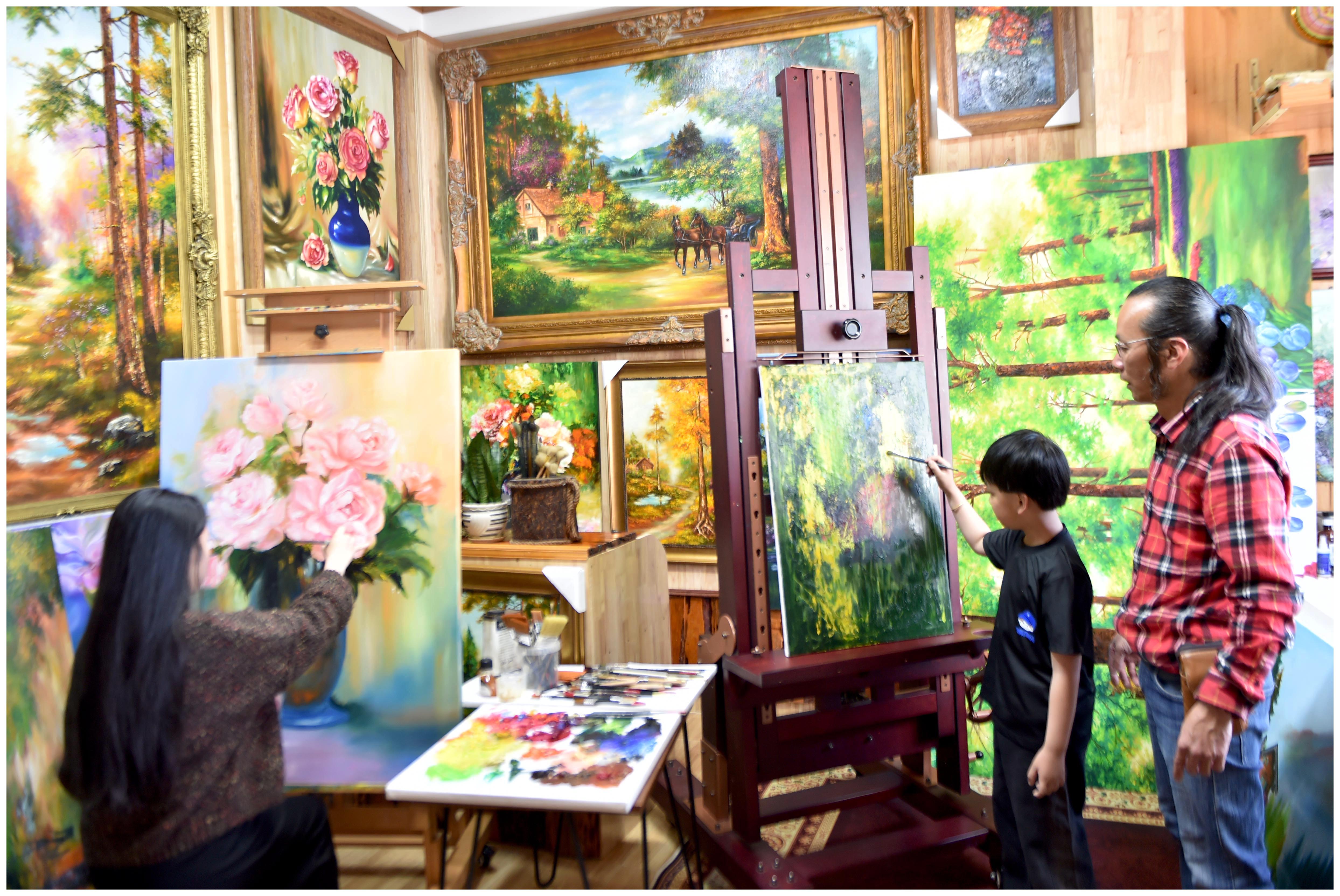 Họa sĩ Huỳnh Sơn Lâm truyền nghề, nuôi dưỡng tình yêu hội họa đến các con. Ảnh: HÀ HỮU NẾT