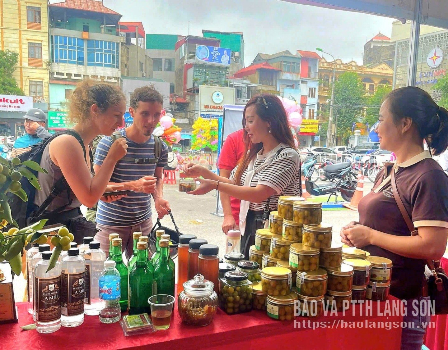Du khách nước ngoài thưởng thức sản phẩm ô mai chanh rừng của HTX Nông trang sinh thái Mẫu Sơn tại gian trưng bày sản phẩm