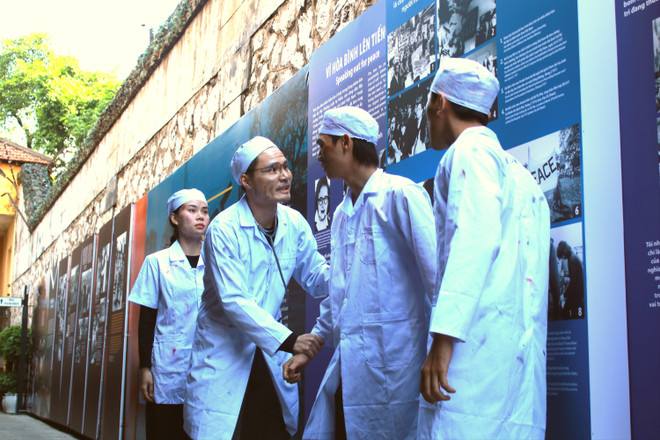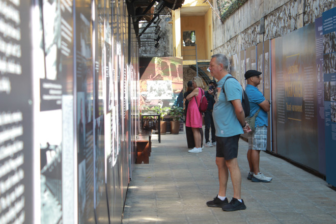 Nhiều du khách quốc tế đến Nhà tù Hỏa Lò và ghé vào trưng bày. (Ảnh: Minh Anh/Vietnam+)