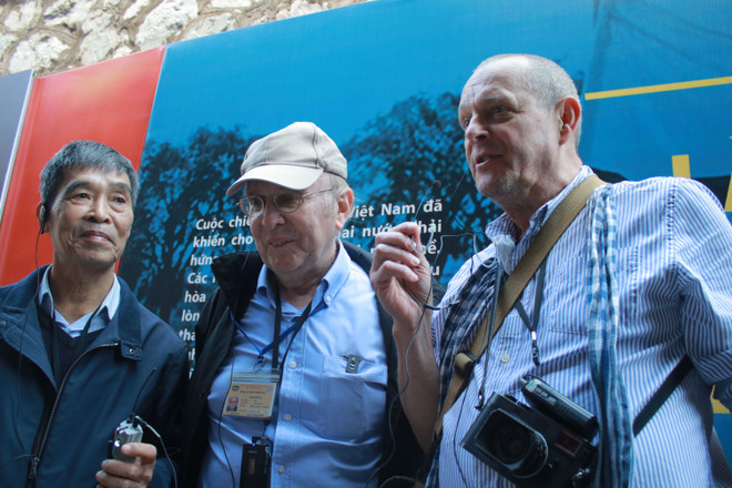 Từ trái sang: Nhà báo Nguyễn Văn Nhân (con rể bác sỹ Đỗ Doãn Đại) làm phiên dịch cho ông Ad Spijkers và nhiếp ảnh gia Andy Soloman. (Ảnh: Minh Anh/Vietnam+)