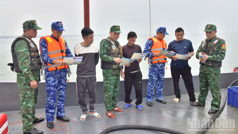 Phối hợp lực lượng Biên phòng phát tờ rơi tuyên truyền phòng, chống IUU cho các chủ phương tiện hoạt động trên khu vực biển Móng Cái, tỉnh Quảng Ninh.