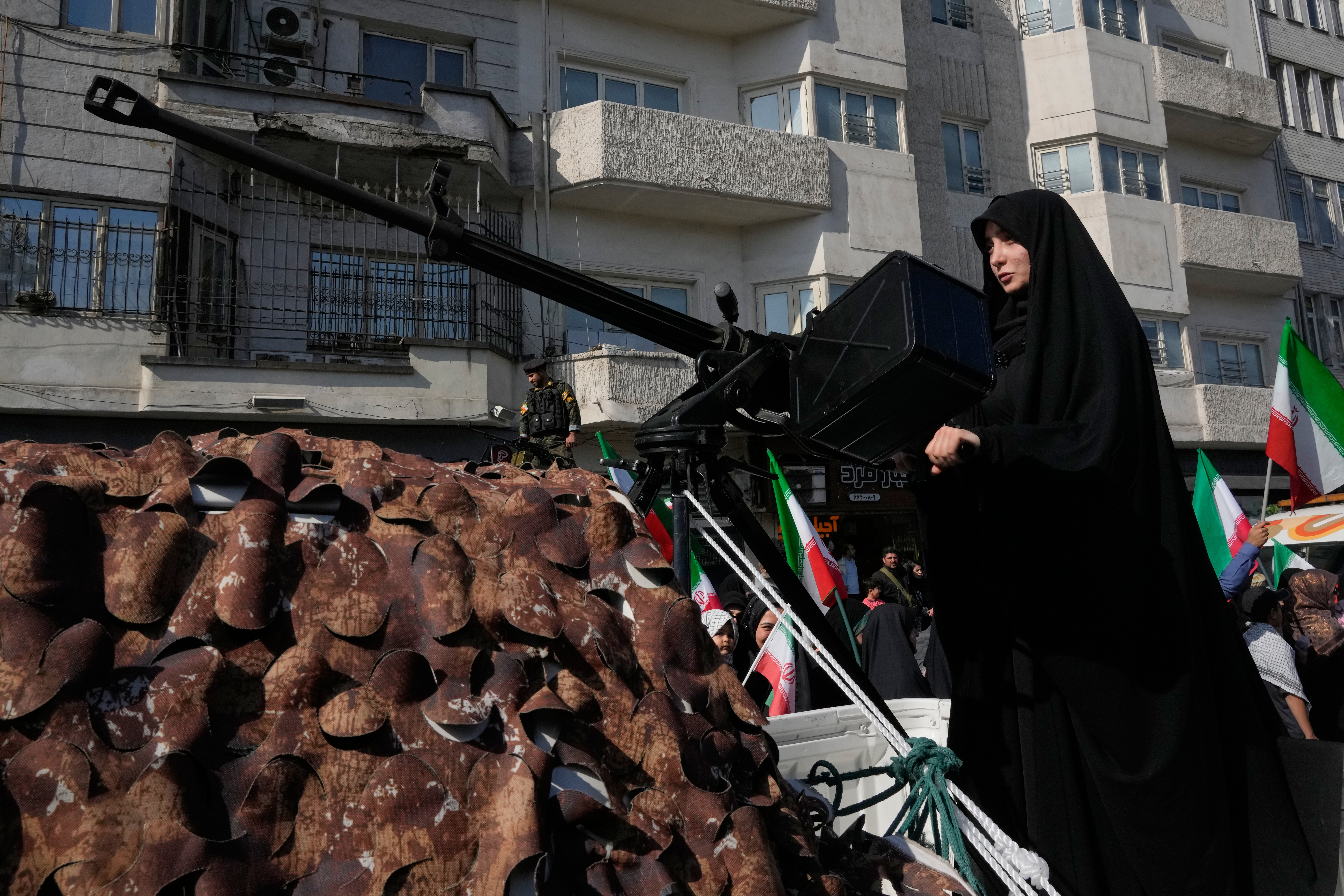 Nữ thành viên của lực lượng bán quân sự Basij, trực thuộc Vệ binh Cách mạng Iran, cầm súng máy trên một chiếc xe bán tải trong một cuộc mít tinh ở Tehran, Iran. (Ảnh AP/Vahid Salemi)