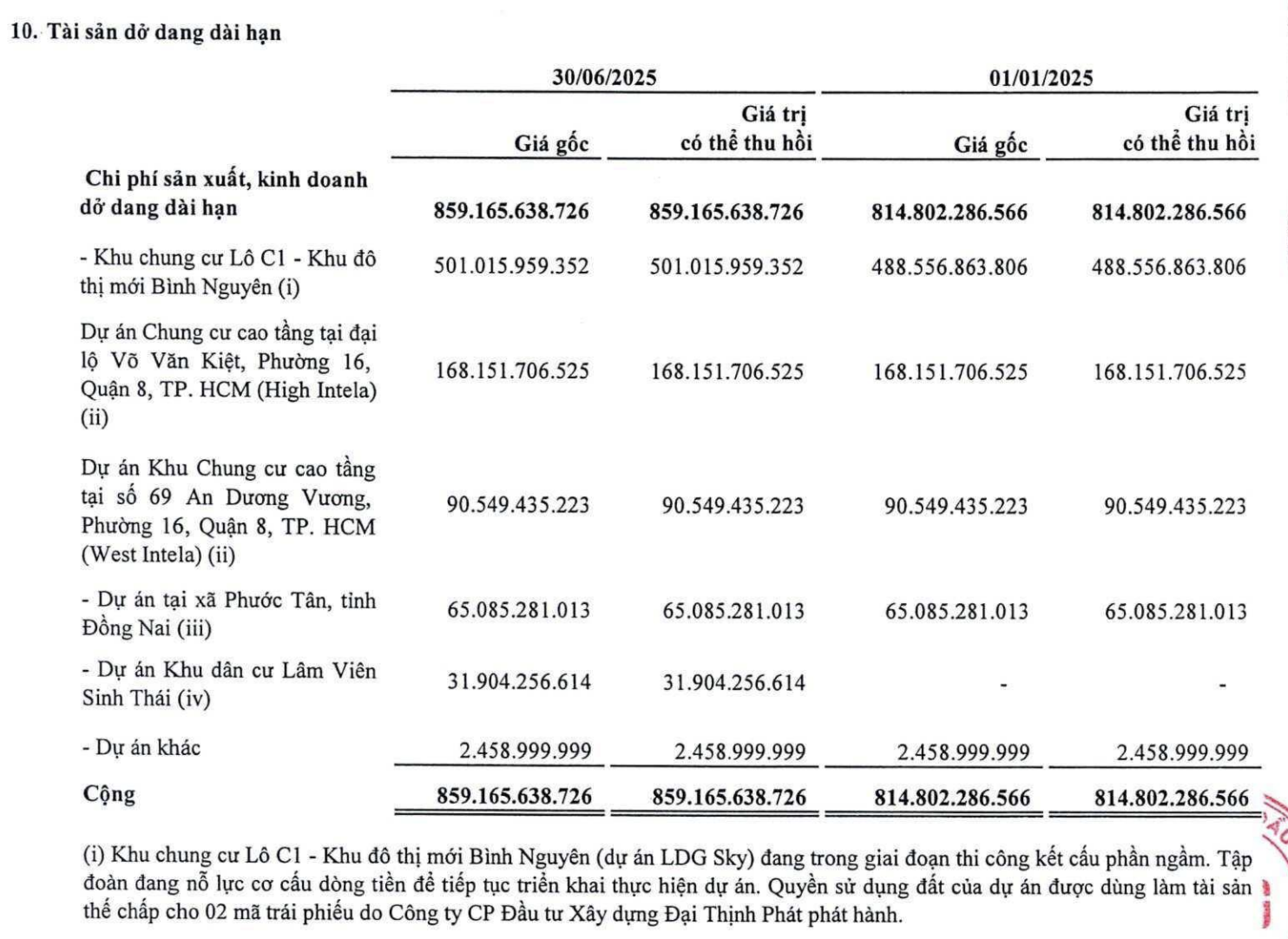 Thêm nữa, tại thời điểm 30/6/2025, Đầu tư LDG cho biết đang ghi nhận 501,02 tỷ đồng chi phí sản xuất dở dang dài hạn dự án khu chung cư Lô C1 tại khu đô thị mới Bình Nguyên (đầu năm 488,6 tỷ đồng).